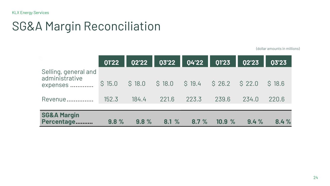 KLX Energy Services 23 Segment Adjusted EBITDA Margin Reconciliation Q1’22 Q2’22 Q3’22 Q4’22 Q1’23 Q2’23 Q3’23 Rocky Mountains Adjusted EBITDA ............. $ 4.7 $ 9.3 $ 17.3 $ 17.9 $ 15.5 $ 17.0 $ 23.3 Revenue ........................... 43.3 53.1 66.5 66.1 67.9 66.4 77.0 Adjusted EBITDA Margin Percentage ....................... 10.9 % 17.5 % 26.0 % 27.1 % 22.8 % 25.6 % 30.3 % Southwest Adjusted EBITDA ............. 4.2 6.4 10.2 12.4 10.2 14.8 11.8 Revenue ........................... 51.9 60.0 68.5 74.8 73.4 86.3 77.8 Adjusted EBITDA Margin Percentage ........................ 8.1 % 10.7 % 14.9 % 16.6 % 13.9 % 17.1 % 15.2 % Northeast/Mid-Con Adjusted EBITDA ............. 2.7 11.1 21.3 19.7 23.7 18.0 11.4 Revenue ........................... 57.1 71.3 86.6 82.4 98.3 81.3 65.8 Adjusted EBITDA Margin Percentage ........................ 4.7 % 15.6 % 24.6 % 23.9 % 24.1 % 22.1 % 17.3 % (dollar amounts in millions)