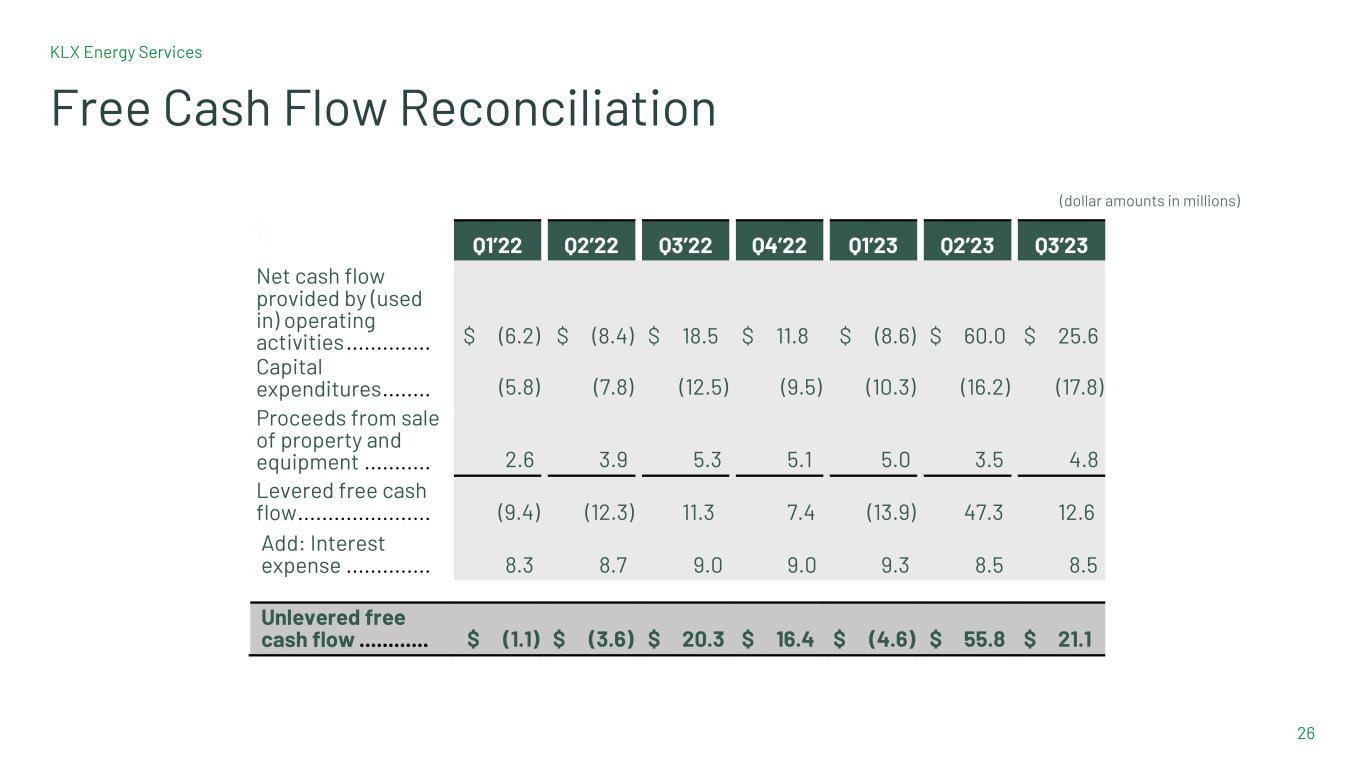 KLX Energy Services 25 Annualized Adjusted EBITDA Reconciliation Q1’22 Q2’22 Q3’22 Q4’22 Q1’23 Q2’23 Q3’23 Adjusted EBITDA $ 4.9 $ 17.4 $ 37.1 $ 37.3 $ 38.2 $ 39.7 $ 36.7 Multiplied by four quarters .............. 4 4 4 4 4 4 4 Annualized Quarterly Adjusted EBITDA ................ $ 19.6 $ 69.6 $ 148.4 $ 149.2 $ 152.8 $ 158.8 $ 146.8 (dollar amounts in millions)