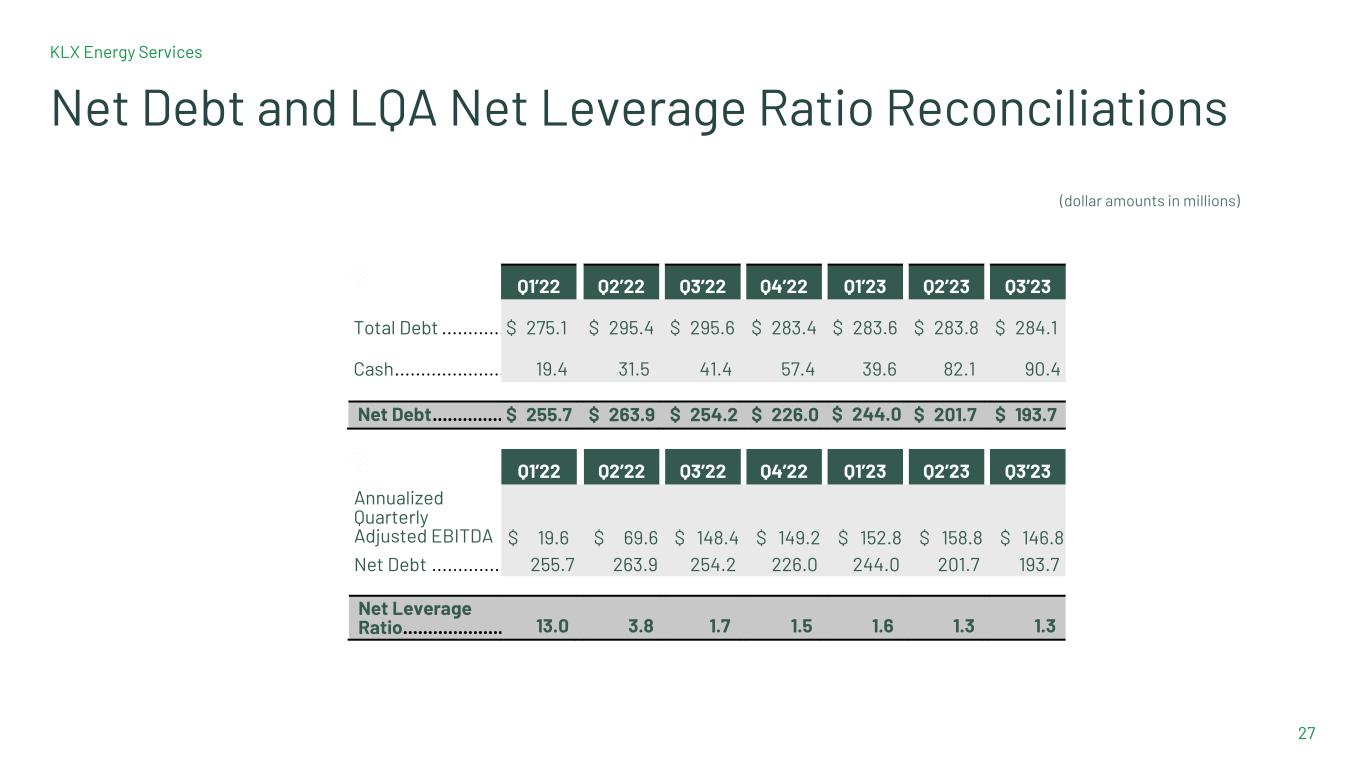 KLX Energy Services 26 Free Cash Flow Reconciliation Q1’22 Q2’22 Q3’22 Q4’22 Q1’23 Q2’23 Q3’23 Net cash flow provided by (used in) operating activities .............. $ (6.2) $ (8.4) $ 18.5 $ 11.8 $ (8.6) $ 60.0 $ 25.6 Capital expenditures ........ (5.8) (7.8) (12.5) (9.5) (10.3) (16.2) (17.8) Proceeds from sale of property and equipment ........... 2.6 3.9 5.3 5.1 5.0 3.5 4.8 Levered free cash flow ...................... (9.4) (12.3) 11.3 7.4 (13.9) 47.3 12.6 Add: Interest expense .............. 8.3 8.7 9.0 9.0 9.3 8.5 8.5 Unlevered free cash flow ............ $ (1.1) $ (3.6) $ 20.3 $ 16.4 $ (4.6) $ 55.8 $ 21.1 (dollar amounts in millions)