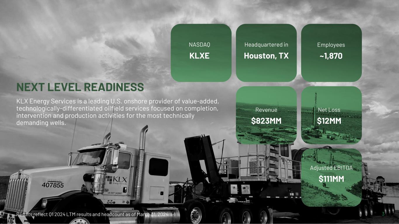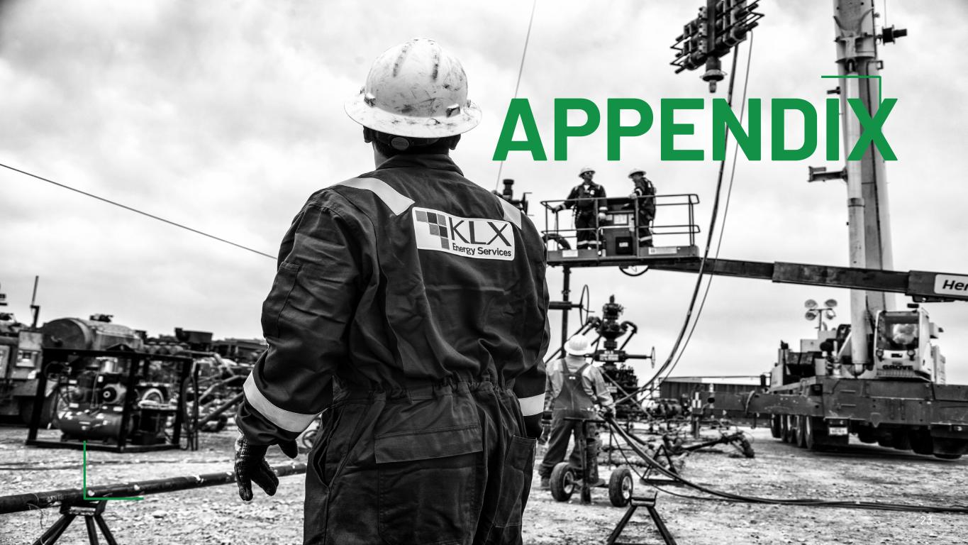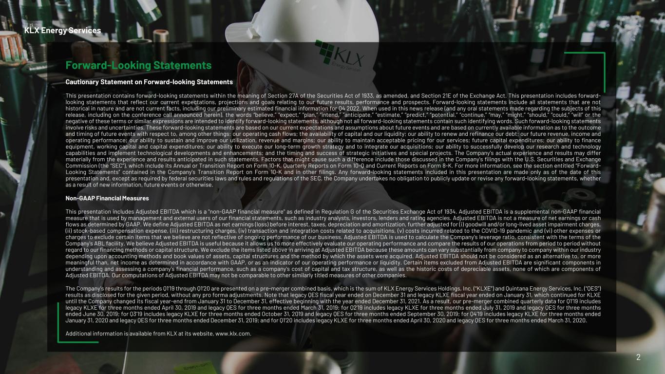 Forward-Looking Statements Cautionary Statement on Forward-looking Statements This presentation contains forward-looking statements within the meaning of Section 27A of the Securities Act of 1933, as amended, and Section 21E of the Exchange Act. This presentation includes forward- looking statements that reflect our current expectations, projections and goals relating to our future results, performance and prospects. Forward-looking statements include all statements that are not historical in nature and are not current facts, including our preliminary estimated financial information for Q4 2022. When used in this news release (and any oral statements made regarding the subjects of this release, including on the conference call announced herein), the words “believe,” “expect,” “plan,” “intend,” “anticipate,” “estimate,” “predict,” “potential,” “continue,” “may,” “might,” “should,” “could,” “will” or the negative of these terms or similar expressions are intended to identify forward-looking statements, although not all forward-looking statements contain such identifying words. Such forward-looking statements involve risks and uncertainties. These forward-looking statements are based on our current expectations and assumptions about future events and are based on currently available information as to the outcome and timing of future events with respect to, among other things: our operating cash flows; the availability of capital and our liquidity; our ability to renew and refinance our debt; our future revenue, income and operating performance; our ability to sustain and improve our utilization, revenue and margins; our ability to maintain acceptable pricing for our services; future capital expenditures; our ability to finance equipment, working capital and capital expenditures; our ability to execute our long-term growth strategy and to integrate our acquisitions; our ability to successfully develop our research and technology capabilities and implement technological developments and enhancements; and the timing and success of strategic initiatives and special projects. The Company’s actual experience and results may differ materially from the experience and results anticipated in such statements. Factors that might cause such a difference include those discussed in the Company’s filings with the U.S. Securities and Exchange Commission (the “SEC”), which include its Annual or Transition Report on Form 10-K, Quarterly Reports on Form 10-Q and Current Reports on Form 8-K. For more information, see the section entitled “Forward- Looking Statements” contained in the Company’s Transition Report on Form 10-K and in other filings. Any forward-looking statements included in this presentation are made only as of the date of this presentation and, except as required by federal securities laws and rules and regulations of the SEC, the Company undertakes no obligation to publicly update or revise any forward-looking statements, whether as a result of new information, future events or otherwise. Non-GAAP Financial Measures This presentation includes Adjusted EBITDA which is a "non-GAAP financial measure" as defined in Regulation G of the Securities Exchange Act of 1934. Adjusted EBITDA is a supplemental non-GAAP financial measure that is used by management and external users of our financial statements, such as industry analysts, investors, lenders and rating agencies. Adjusted EBITDA is not a measure of net earnings or cash flows as determined by GAAP. We define Adjusted EBITDA as net earnings (loss) before interest, taxes, depreciation and amortization, further adjusted for (i) goodwill and/or long-lived asset impairment charges, (ii) stock-based compensation expense, (iii) restructuring charges, (iv) transaction and integration costs related to acquisitions, (v) costs incurred related to the COVID-19 pandemic and (vi) other expenses or charges to exclude certain items that we believe are not reflective of ongoing performance of our business. Adjusted EBITDA is used to calculate the Company's leverage ratio, consistent with the terms of the Company's ABL facility. We believe Adjusted EBITDA is useful because it allows us to more effectively evaluate our operating performance and compare the results of our operations from period to period without regard to our financing methods or capital structure. We exclude the items listed above in arriving at Adjusted EBITDA because these amounts can vary substantially from company to company within our industry depending upon accounting methods and book values of assets, capital structures and the method by which the assets were acquired. Adjusted EBITDA should not be considered as an alternative to, or more meaningful than, net income as determined in accordance with GAAP, or as an indicator of our operating performance or liquidity. Certain items excluded from Adjusted EBITDA are significant components in understanding and assessing a company's financial performance, such as a company's cost of capital and tax structure, as well as the historic costs of depreciable assets, none of which are components of Adjusted EBITDA. Our computations of Adjusted EBITDA may not be comparable to other similarly titled measures of other companies. The Company’s results for the periods Q1’19 through Q1’20 are presented on a pre-merger combined basis, which is the sum of KLX Energy Services Holdings, Inc. (“KLXE”) and Quintana Energy Services, Inc. (“QES”) results as disclosed for the given period, without any pro forma adjustments. Note that legacy QES fiscal year ended on December 31 and legacy KLXE fiscal year ended on January 31, which continued for KLXE until the Company changed its fiscal year-end from January 31 to December 31, effective beginning with the year ended December 31, 2021. As a result, our pre-merger combined quarterly data for Q1’19 includes legacy KLXE for three months en