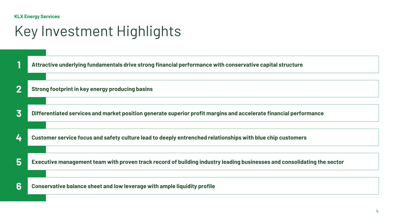 3 NEXT LEVEL READINESS KLX Energy Services is a leading U.S. onshore provider of value-added, technologically-differentiated oilfield services focused on completion, intervention and production activities for the most technically demanding wells. NASDAQ KLXE Headquartered in Houston, TX Employees ~1,870 Revenue $823MM Net Loss $12MM Adjusted EBITDA $111MM Results reflect Q1 2024 LTM results and headcount as of March 31, 2024
