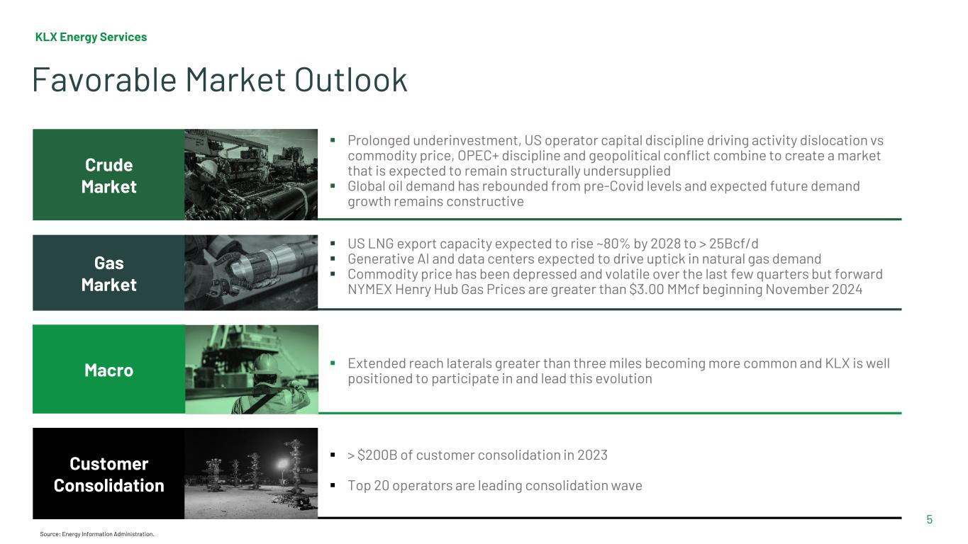 KLX Energy Services 4 Key Investment Highlights Attractive underlying fundamentals drive strong financial performance with conservative capital structure1 Strong footprint in key energy producing basins 2 Differentiated services and market position generate superior profit margins and accelerate financial performance3 Customer service focus and safety culture lead to deeply entrenched relationships with blue chip customers4 Executive management team with proven track record of building industry leading businesses and consolidating the sector5 Conservative balance sheet and low leverage with ample liquidity profile6