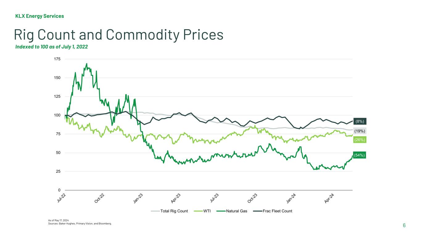  Extended reach laterals greater than three miles becoming more common and KLX is well positioned to participate in and lead this evolution KLX Energy Services 5 Macro Customer Consolidation  > $200B of customer consolidation in 2023  Top 20 operators are leading consolidation wave Favorable Market Outlook  Prolonged underinvestment, US operator capital discipline driving activity dislocation vs commodity price, OPEC+ discipline and geopolitical conflict combine to create a market that is expected to remain structurally undersupplied  Global oil demand has rebounded from pre-Covid levels and expected future demand growth remains constructive Crude Market Gas Market  US LNG export capacity expected to rise ~80% by 2028 to > 25Bcf/d  Generative AI and data centers expected to drive uptick in natural gas demand  Commodity price has been depressed and volatile over the last few quarters but forward NYMEX Henry Hub Gas Prices are greater than $3.00 MMcf beginning November 2024 Source: Energy Information Administration.