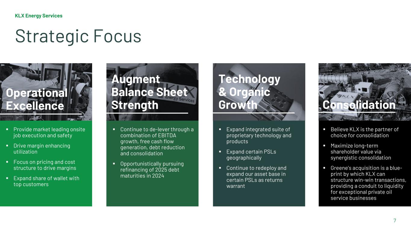KLX Energy Services 6 Rig Count and Commodity Prices As of May 17, 2024 Sources: Baker Hughes, Primary Vision, and Bloomberg. Indexed to 100 as of July 1, 2022 0 25 50 75 100 125 150 175 Total Rig Count WTI Natural Gas Frac Fleet Count (26%) (19%) (8%) (54%)