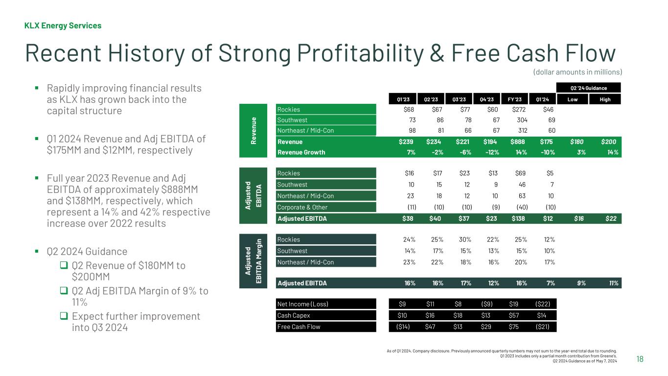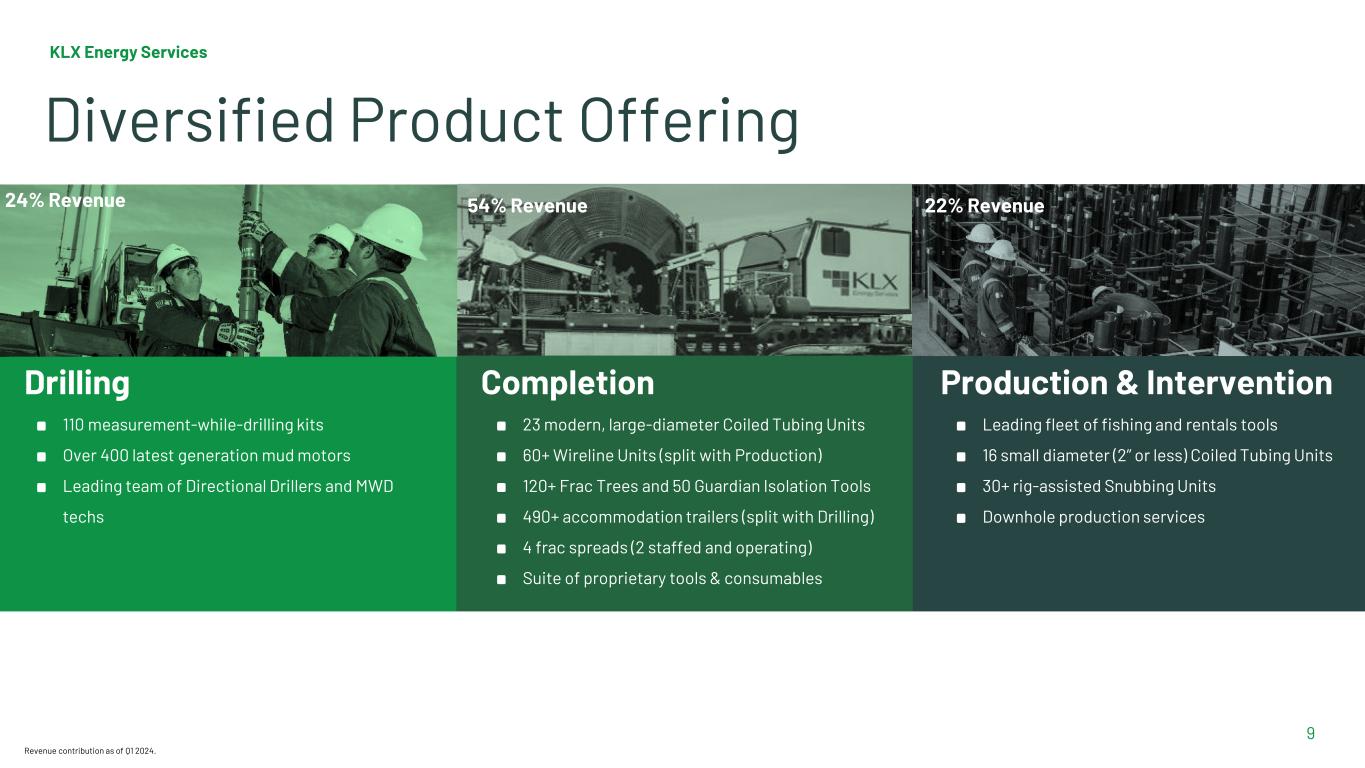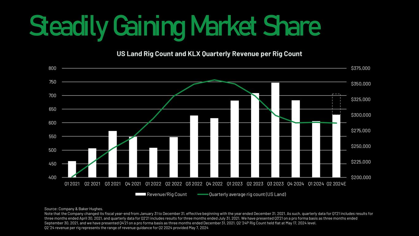 Steadily Gaining Market Share US Land Rig Count and KLX Quarterly Revenue per Rig Count Source: Company & Baker Hughes. Note that the Company changed its fiscal year-end from January 31 to December 31, effective beginning with the year ended December 31, 2021. As such, quarterly data for Q1’21 includes results for three months ended April 30, 2021, and quarterly data for Q2’21 includes results for three months ended July 31, 2021. We have presented Q3’21 on a pro forma basis as three months ended September 30, 2021, and we have presented Q4’21 on a pro forma basis as three months ended December 31, 2021. Q2 ’24P Rig Count held flat at May 17, 2024 level. Q2 ’24 revenue per rig represents the range of revenue guidance for Q2 2024 provided May 7, 2024 $200,000 $225,000 $250,000 $275,000 $300,000 $325,000 $350,000 $375,000 400 450 500 550 600 650 700 750 800 Q1 2021 Q2 2021 Q3 2021 Q4 2021 Q1 2022 Q2 2022 Q3 2022 Q4 2022 Q1 2023 Q2 2023 Q3 2023 Q4 2024 Q1 2024 Q2 2024E Revenue/Rig Count Quarterly average rig count (US Land)