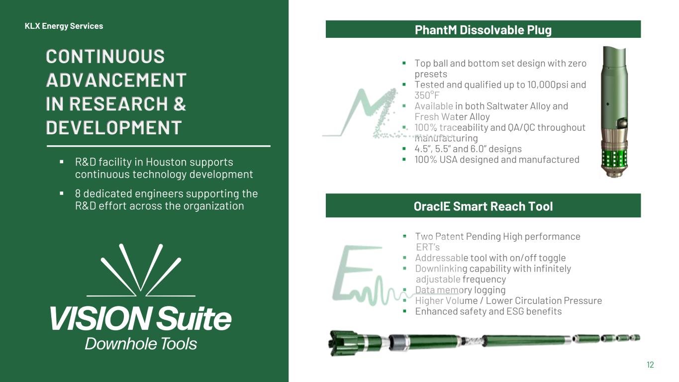  Wide range of well construction equipment spanning a variety of sizes and configurations  HPHT float equipment  Latch-in plugs and wiper plugs  Centralizers  2-stage cement tools and annular casing packers  Liner hanger systems  Proprietary MWD tool design and packaging  Proprietary surface system  SHRIMPTM – Slim High-Res Inertial Measurement Probe  Mud Motor – proprietary lower end and in-house manufacturing  Fleet of open-hole fishing tools KLX Energy Services 11 Directional Drilling Well Construction Completions Production  Composite and PhantM dissolvable frac plugs  Retrievable packers and bridge plugs  Proprietary Oracle SRT Extended Reach Tool (“ERT”) (Two patents pending)  Proprietary and patented PDC bearing mud motor  Suite of Whisper Series electric Wireline, Snubbing and Coiled Tubing equipment  Production packers  Packer tubing accessories  Complete suite of cast iron products, including CICR and CIBP  Service tools for remedial and workover, including squeeze, cement, swab testing, etc.  Comprehensive suite of proprietary fishing tools Technological Differentiation Drives Operational Efficiencies