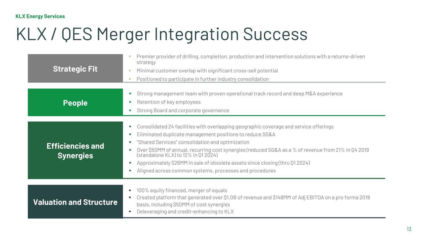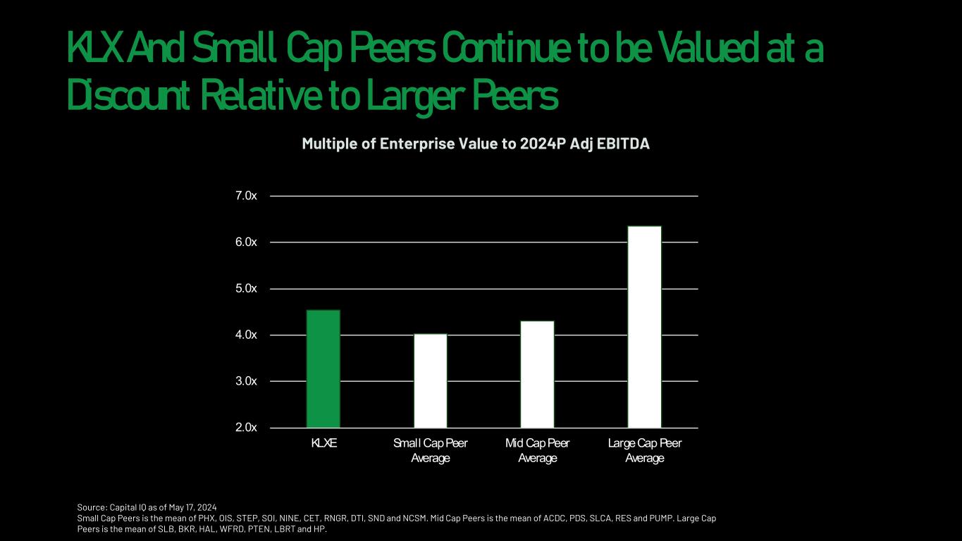 KLX And Small Cap Peers Continue to be Valued at a Discount Relative to Larger Peers Source: Capital IQ as of May 17, 2024 Small Cap Peers is the mean of PHX, OIS, STEP, SOI, NINE, CET, RNGR, DTI, SND and NCSM. Mid Cap Peers is the mean of ACDC, PDS, SLCA, RES and PUMP. Large Cap Peers is the mean of SLB, BKR, HAL, WFRD, PTEN, LBRT and HP. Multiple of Enterprise Value to 2024P Adj EBITDA 2.0x 3.0x 4.0x 5.0x 6.0x 7.0x KLXE Small Cap Peer Average Mid Cap Peer Average Large Cap Peer Average
