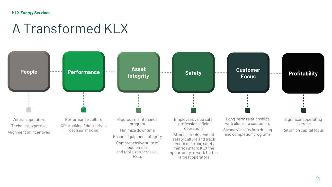  Strong management team with proven operational track record and deep M&A experience  Retention of key employees  Strong Board and corporate governance  Premier provider of drilling, completion, production and intervention solutions with a returns-driven strategy  Minimal customer overlap with significant cross-sell potential  Positioned to participate in further industry consolidation KLX Energy Services 13 Strategic Fit People Efficiencies and Synergies Valuation and Structure  Consolidated 24 facilities with overlapping geographic coverage and service offerings  Eliminated duplicate management positions to reduce SG&A  “Shared Services” consolidation and optimization  Over $50MM of annual, recurring cost synergies (reduced SG&A as a % of revenue from 21% in Q4 2019 (standalone KLX) to 12% in Q1 2024)  Approximately $26MM in sale of obsolete assets since closing (thru Q1 2024)  Aligned across common systems, processes and procedures  100% equity financed, merger of equals  Created platform that generated over $1.0B of revenue and $148MM of Adj EBITDA on a pro forma 2019 basis, including $50MM of cost synergies  Deleveraging and credit-enhancing to KLX KLX / QES Merger Integration Success