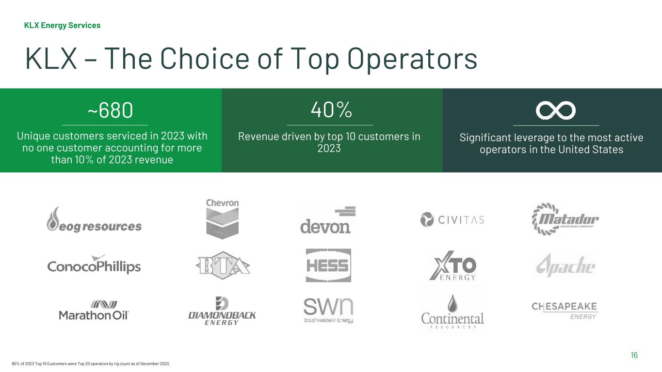 15 Recent Acquisition Case Study In March 2023, KLX and Greene’s formed a strong partnership based on a common culture focused on safety, execution, customer service and returns. The combined company is a leading provider of wellhead protection, flowback and well testing services. The acquisition of Greene’s augmented the KLX frac rental and flowback offerings, providing KLX with a broader presence in the Permian and Eagle Ford basins. 2022 Adjusted EBITDA $15MM 2022 Revenue $69MM All Stock Transaction 2.4MM Shares Enterprise Value $30MM 2022 Net Income $5MM Fixed Cost Synergies $3MM All results reflect standalone performance for Greene’s.