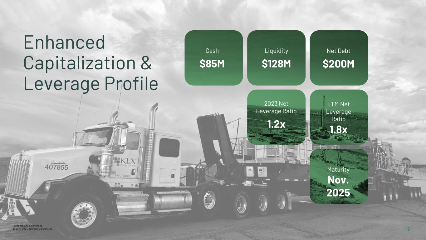 KLX Energy Services 18 Recent History of Strong Profitability & Free Cash Flow  Rapidly improving financial results as KLX has grown back into the capital structure  Q1 2024 Revenue and Adj EBITDA of $175MM and $12MM, respectively  Full year 2023 Revenue and Adj EBITDA of approximately $888MM and $138MM, respectively, which represent a 14% and 42% respective increase over 2022 results  Q2 2024 Guidance  Q2 Revenue of $180MM to $200MM  Q2 Adj EBITDA Margin of 9% to 11%  Expect further improvement into Q3 2024 As of Q1 2024. Company disclosure. Previously announced quarterly numbers may not sum to the year-end total due to rounding. Q1 2023 includes only a partial month contribution from Greene’s. Q2 2024 Guidance as of May 7, 2024 (dollar amounts in millions) Q1 '23 Q2 '23 Q3 '23 Q4 '23 FY '23 Q1 '24 Low High Rockies $68 $67 $77 $60 $272 $46 Southwest 73 86 78 67 304 69 Northeast / Mid-Con 98 81 66 67 312 60 Revenue $239 $234 $221 $194 $888 $175 $180 $200 Revenue Growth 7% -2% -6% -12% 14% -10% 3% 14% Rockies $16 $17 $23 $13 $69 $5 Southwest 10 15 12 9 46 7 Northeast / Mid-Con 23 18 12 10 63 10 Corporate & Other (11) (10) (10) (9) (40) (10) Adjusted EBITDA $38 $40 $37 $23 $138 $12 $16 $22 Rockies 24% 25% 30% 22% 25% 12% Southwest 14% 17% 15% 13% 15% 10% Northeast / Mid-Con 23% 22% 18% 16% 20% 17% Adjusted EBITDA 16% 16% 17% 12% 16% 7% 9% 11% Net Income (Loss) $9 $11 $8 ($9) $19 ($22) Cash Capex $10 $16 $18 $13 $57 $14 Free Cash Flow ($14) $47 $13 $29 $75 ($21) Re ve nu e A dj us te d EB IT DA A dj us te d EB IT DA M ar gi n Q2 '24 Guidance