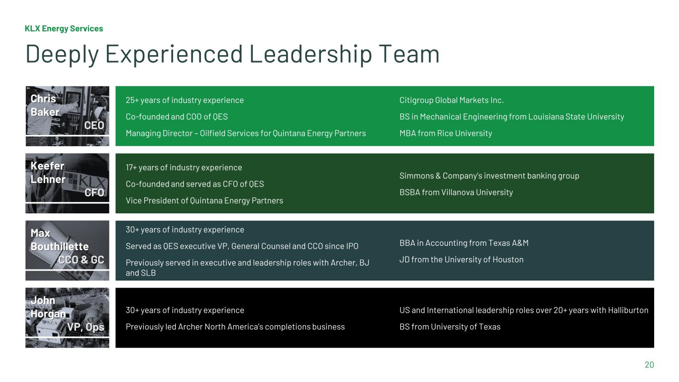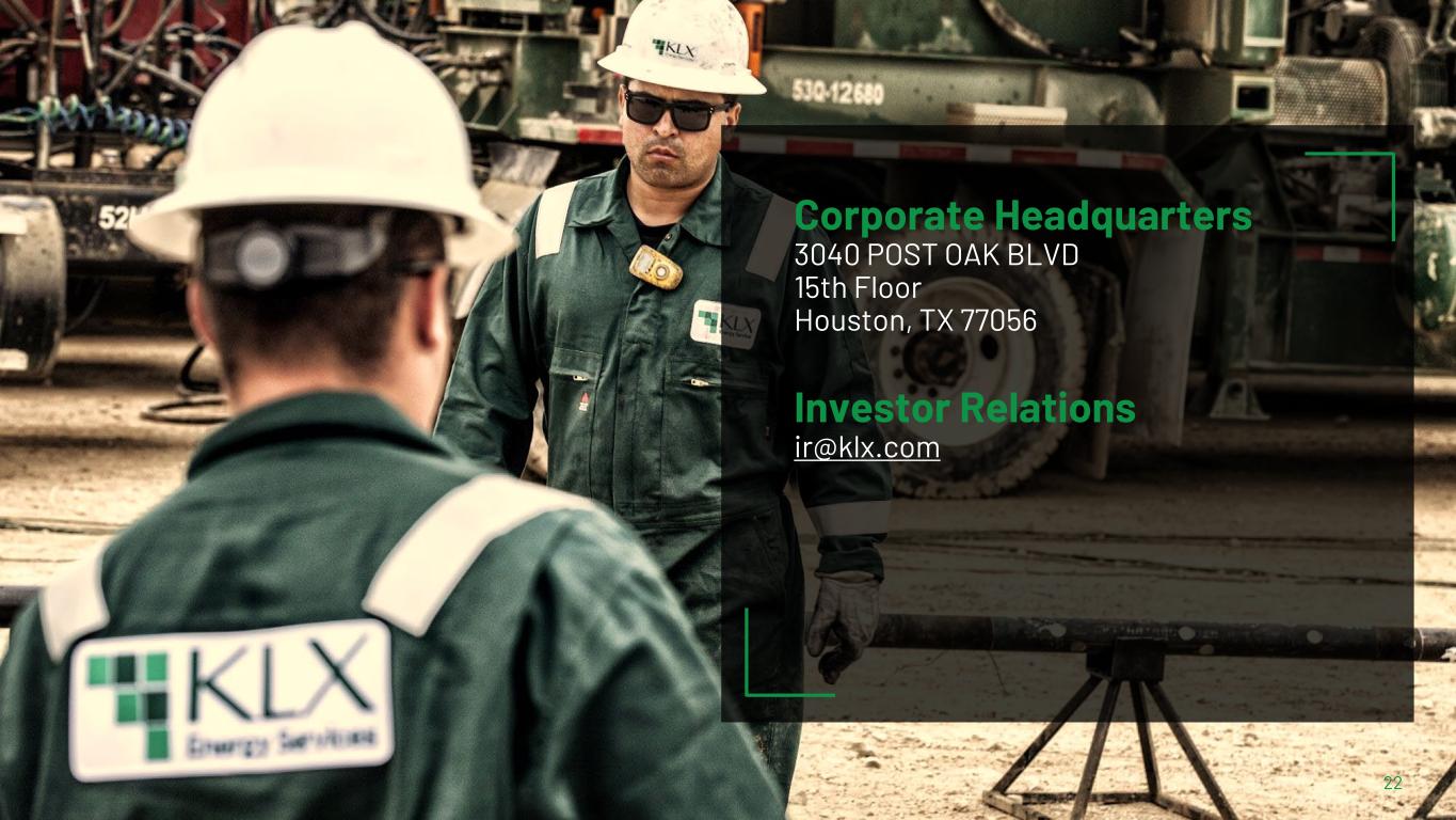 KLX Energy Services 20 Deeply Experienced Leadership Team Chris Baker CEO 25+ years of industry experience Co-founded and COO of QES Managing Director – Oilfield Services for Quintana Energy Partners Citigroup Global Markets Inc. BS in Mechanical Engineering from Louisiana State University MBA from Rice University Keefer Lehner CFO 17+ years of industry experience Co-founded and served as CFO of QES Vice President of Quintana Energy Partners Simmons & Company’s investment banking group BSBA from Villanova University Max Bouthillette CCO & GC 30+ years of industry experience Served as QES executive VP, General Counsel and CCO since IPO Previously served in executive and leadership roles with Archer, BJ and SLB BBA in Accounting from Texas A&M JD from the University of Houston John Horgan VP, Ops 30+ years of industry experience Previously led Archer North America’s completions business US and International leadership roles over 20+ years with Halliburton BS from University of Texas