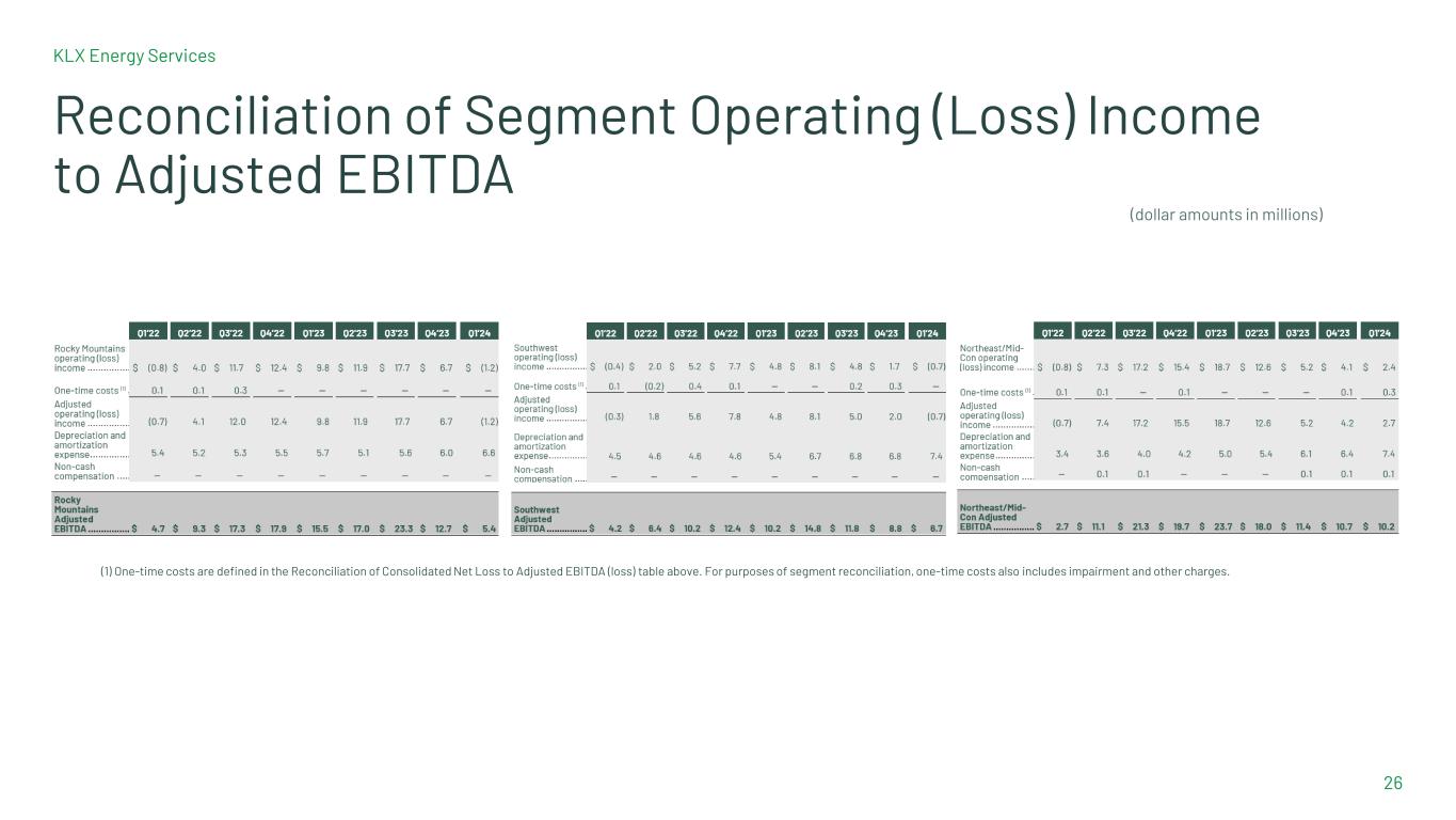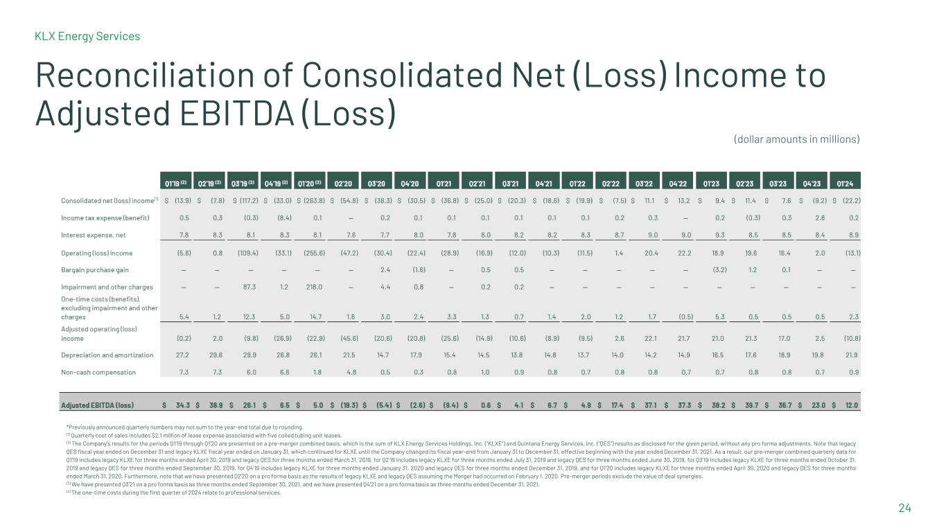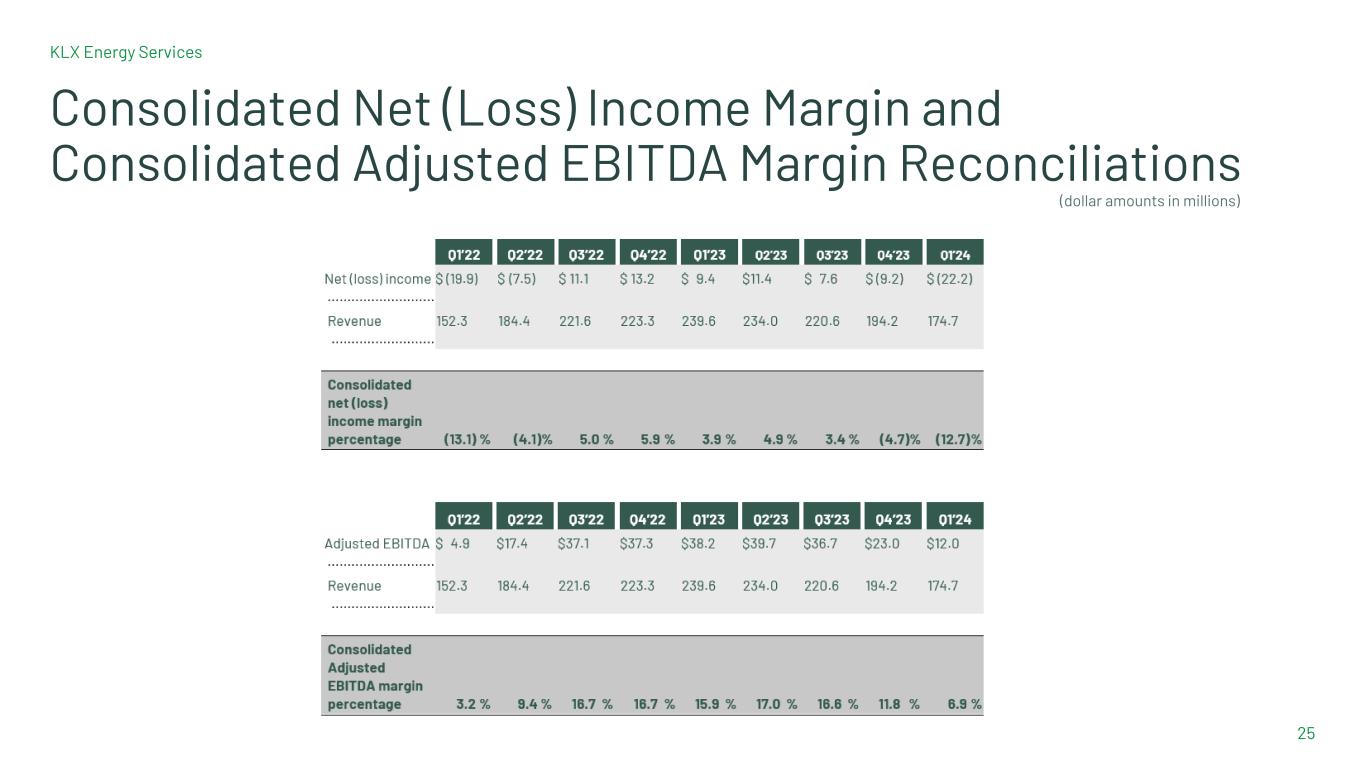 KLX Energy Services 24 Reconciliation of Consolidated Net (Loss) Income to Adjusted EBITDA (Loss) *Previously announced quarterly numbers may not sum to the year-end total due to rounding. (1) Quarterly cost of sales includes $2.1 million of lease expense associated with five coiled tubing unit leases. (2) The Company’s results for the periods Q1’19 through Q1’20 are presented on a pre-merger combined basis, which is the sum of KLX Energy Services Holdings, Inc. (“KLXE”) and Quintana Energy Services, Inc. (“QES”) results as disclosed for the given period, without any pro forma adjustments. Note that legacy QES fiscal year ended on December 31 and legacy KLXE fiscal year ended on January 31, which continued for KLXE until the Company changed its fiscal year-end from January 31 to December 31, effective beginning with the year ended December 31, 2021. As a result, our pre-merger combined quarterly data for Q1’19 includes legacy KLXE for three months ended April 30, 2019 and legacy QES for three months ended March 31, 2019, for Q2’19 includes legacy KLXE for three months ended July 31, 2019 and legacy QES for three months ended June 30, 2019, for Q3’19 includes legacy KLXE for three months ended October 31, 2019 and legacy QES for three months ended September 30, 2019, for Q4’19 includes legacy KLXE for three months ended January 31, 2020 and legacy QES for three months ended December 31, 2019, and for Q1’20 includes legacy KLXE for three months ended April 30, 2020 and legacy QES for three months ended March 31, 2020. Furthermore, note that we have presented Q2’20 on a pro forma basis as the results of legacy KLXE and legacy QES assuming the Merger had occurred on February 1, 2020. Pre-merger periods exclude the value of deal synergies. (3) We have presented Q3’21 on a pro forma basis as three months ended September 30, 2021, and we have presented Q4’21 on a pro forma basis as three months ended December 31, 2021. (4) The one-time costs during the first quarter of 2024 relate to professional services. (dollar amounts in millions)