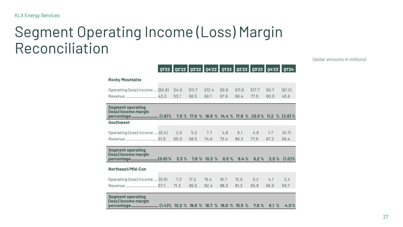 KLX Energy Services 26 Reconciliation of Segment Operating (Loss) Income to Adjusted EBITDA (1) One-time costs are defined in the Reconciliation of Consolidated Net Loss to Adjusted EBITDA (loss) table above. For purposes of segment reconciliation, one-time costs also includes impairment and other charges. (dollar amounts in millions)