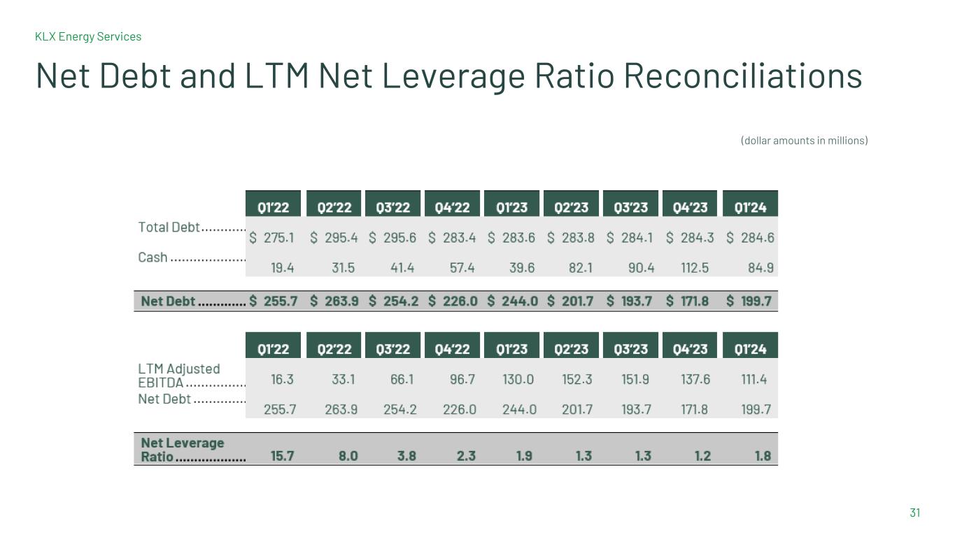 KLX Energy Services 31 Net Debt and LTM Net Leverage Ratio Reconciliations (dollar amounts in millions)