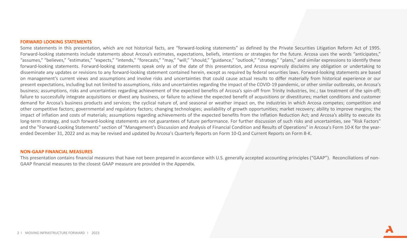 2 I MOVING INFRASTRUCTURE FORWARD I 2023 FORWARD LOOKING STATEMENTS Some statements in this presentation, which are not historical facts, are “forward-looking statements” as defined by the Private Securities Litigation Reform Act of 1995. Forward-looking statements include statements about Arcosa’s estimates, expectations, beliefs, intentions or strategies for the future. Arcosa uses the words “anticipates,” “assumes,” “believes,” “estimates,” “expects,” “intends,” “forecasts,” “may,” “will,” “should,” “guidance,” “outlook,” “strategy,” “plans,” and similar expressions to identify these forward-looking statements. Forward-looking statements speak only as of the date of this presentation, and Arcosa expressly disclaims any obligation or undertaking to disseminate any updates or revisions to any forward-looking statement contained herein, except as required by federal securities laws. Forward-looking statements are based on management’s current views and assumptions and involve risks and uncertainties that could cause actual results to differ materially from historical experience or our present expectations, including but not limited to assumptions, risks and uncertainties regarding the impact of the COVID-19 pandemic, or other similar outbreaks, on Arcosa's business; assumptions, risks and uncertainties regarding achievement of the expected benefits of Arcosa’s spin-off from Trinity Industries, Inc.; tax treatment of the spin-off; failure to successfully integrate acquisitions or divest any business, or failure to achieve the expected benefit of acquisitions or divestitures; market conditions and customer demand for Arcosa’s business products and services; the cyclical nature of, and seasonal or weather impact on, the industries in which Arcosa competes; competition and other competitive factors; governmental and regulatory factors; changing technologies; availability of growth opportunities; market recovery; ability to improve margins; the impact of inflation and costs of materials; assumptions regarding achievements of the expected benefits from the Inflation Reduction Act; and Arcosa’s ability to execute its long-term strategy, and such forward-looking statements are not guarantees of future performance. For further discussion of such risks and uncertainties, see "Risk Factors" and the "Forward-Looking Statements" section of "Management's Discussion and Analysis of Financial Condition and Results of Operations" in Arcosa's Form 10-K for the year- ended December 31, 2022 and as may be revised and updated by Arcosa's Quarterly Reports on Form 10-Q and Current Reports on Form 8-K. NON-GAAP FINANCIAL MEASURES This presentation contains financial measures that have not been prepared in accordance with U.S. generally accepted accounting principles (“GAAP”). Reconciliations of non- GAAP financial measures to the closest GAAP measure are provided in the Appendix.