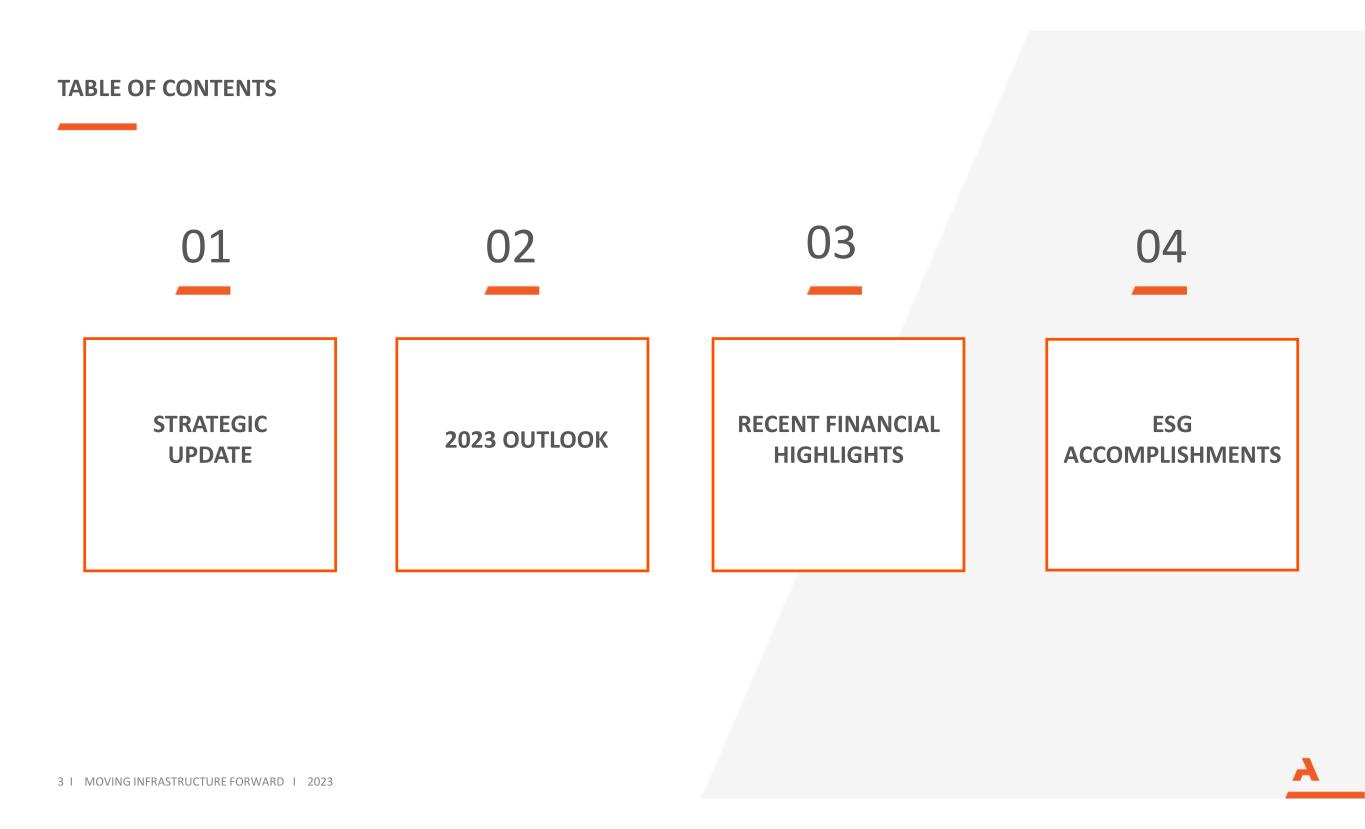 01 03 04 STRATEGIC UPDATE ESG ACCOMPLISHMENTS 02 RECENT FINANCIAL HIGHLIGHTS TABLE OF CONTENTS 3 I MOVING INFRASTRUCTURE FORWARD I 2023 2023 OUTLOOK