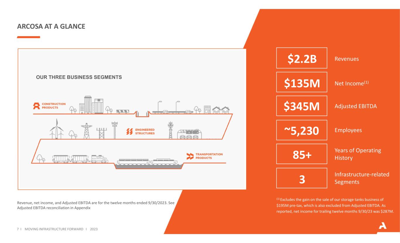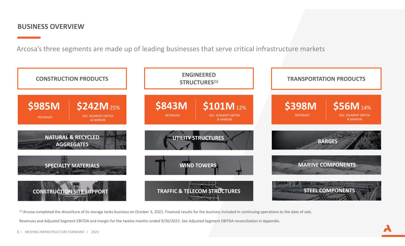 ARCOSA AT A GLANCE Revenue, net income, and Adjusted EBITDA are for the twelve months ended 9/30/2023. See Adjusted EBITDA reconciliation in Appendix Net Income(1) Adjusted EBITDA Infrastructure-related Segments Employees Years of Operating History OUR THREE BUSINESS SEGMENTS Revenues$2.2B $135M $345M ~5,230 85+ 3 7 I MOVING INFRASTRUCTURE FORWARD I 2023 (1) Excludes the gain on the sale of our storage tanks business of $195M pre-tax, which is also excluded from Adjusted EBITDA. As reported, net income for trailing twelve months 9/30/23 was $287M.