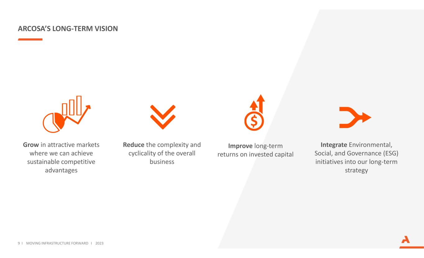 BUSINESS OVERVIEW ENGINEERED STRUCTURES(1) TRANSPORTATION PRODUCTSCONSTRUCTION PRODUCTS (1) Arcosa completed the divestiture of its storage tanks business on October 3, 2022. Financial results for the business included in continuing operations to the date of sale. Revenues and Adjusted Segment EBITDA and margin for the twelve months ended 9/30/2023. See Adjusted Segment EBITDA reconciliation in Appendix. NATURAL & RECYCLED AGGREGATES SPECIALTY MATERIALS CONSTRUCTION SITE SUPPORT WIND TOWERS UTILITY STRUCTURES BARGES STEEL COMPONENTS Arcosa’s three segments are made up of leading businesses that serve critical infrastructure markets REVENUES ADJ. SEGMENT EBITDA & MARGIN $985M $843M $398M $242M 25% $101M 12% $56M 14% REVENUES ADJ. SEGMENT EBITDA & MARGIN REVENUES ADJ. SEGMENT EBITDA & MARGIN MARINE COMPONENTS 8 I MOVING INFRASTRUCTURE FORWARD I 2023 TRAFFIC & TELECOM STRUCTURES