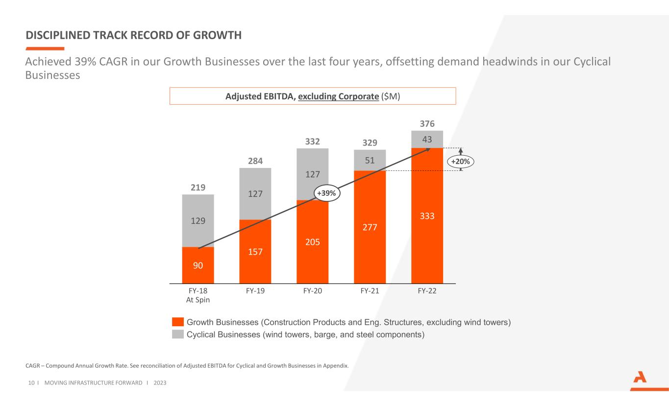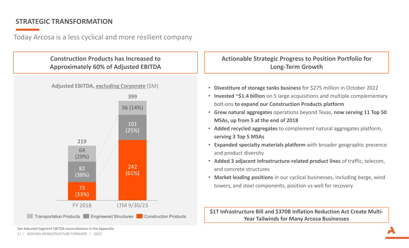 90 157 205 277 333129 127 127 51 43 FY-18 At Spin FY-19 FY-22FY-21FY-20 219 284 332 329 376 +20% DISCIPLINED TRACK RECORD OF GROWTH Adjusted EBITDA, excluding Corporate ($M) CAGR – Compound Annual Growth Rate. See reconciliation of Adjusted EBITDA for Cyclical and Growth Businesses in Appendix. Achieved 39% CAGR in our Growth Businesses over the last four years, offsetting demand headwinds in our Cyclical Businesses Growth Businesses (Construction Products and Eng. Structures, excluding wind towers) Cyclical Businesses (wind towers, barge, and steel components) 10 I MOVING INFRASTRUCTURE FORWARD I 2023 +39%