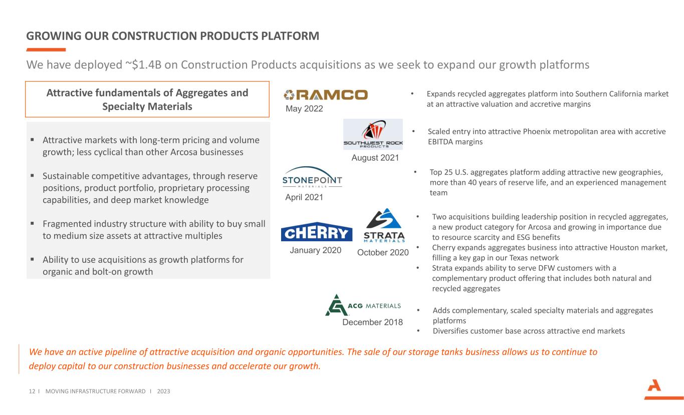 STRATEGIC TRANSFORMATION Adjusted EBITDA, excluding Corporate ($M) 73 (33%) LTM 9/30/23 64 (29%) 82 (38%) FY 2018 242 (61%) 56 (14%) 101 (25%) 219 399 See Adjusted Segment EBITDA reconciliations in the Appendix. Construction Products has Increased to Approximately 60% of Adjusted EBITDA • Divestiture of storage tanks business for $275 million in October 2022 • Invested ~$1.4 billion on 5 large acquisitions and multiple complementary bolt-ons to expand our Construction Products platform • Grew natural aggregates operations beyond Texas, now serving 11 Top 50 MSAs, up from 5 at the end of 2018 • Added recycled aggregates to complement natural aggregates platform, serving 3 Top 5 MSAs • Expanded specialty materials platform with broader geographic presence and product diversity • Added 3 adjacent infrastructure-related product lines of traffic, telecom, and concrete structures • Market leading positions in our cyclical businesses, including barge, wind towers, and steel components, position us well for recovery $1T Infrastructure Bill and $370B Inflation Reduction Act Create Multi- Year Tailwinds for Many Arcosa Businesses Actionable Strategic Progress to Position Portfolio for Long-Term Growth Today Arcosa is a less cyclical and more resilient company 11 I MOVING INFRASTRUCTURE FORWARD I 2023 Transportation Products Engineered Structures Construction Products