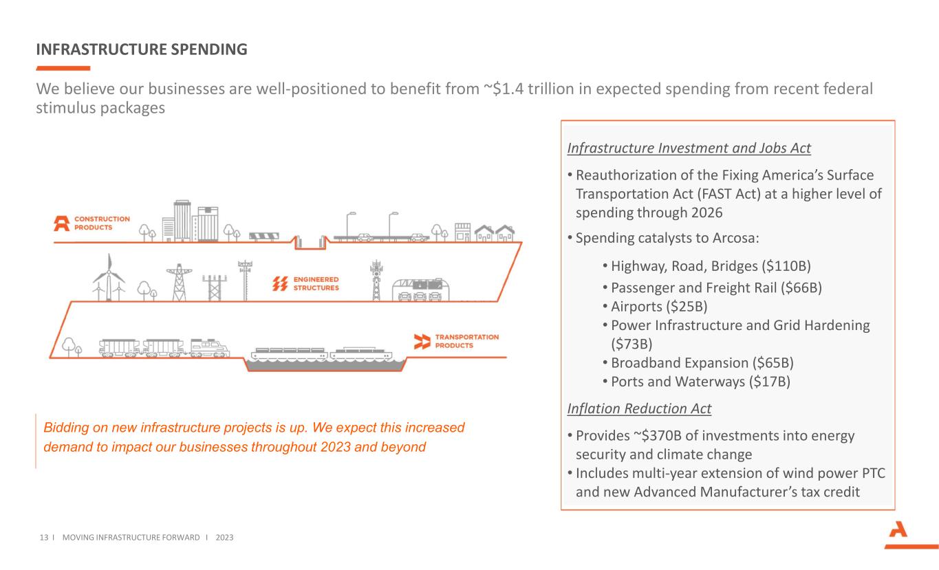 GROWING OUR CONSTRUCTION PRODUCTS PLATFORM  Attractive markets with long-term pricing and volume growth; less cyclical than other Arcosa businesses  Sustainable competitive advantages, through reserve positions, product portfolio, proprietary processing capabilities, and deep market knowledge  Fragmented industry structure with ability to buy small to medium size assets at attractive multiples  Ability to use acquisitions as growth platforms for organic and bolt-on growth We have an active pipeline of attractive acquisition and organic opportunities. The sale of our storage tanks business allows us to continue to deploy capital to our construction businesses and accelerate our growth. October 2020January 2020 December 2018 • Top 25 U.S. aggregates platform adding attractive new geographies, more than 40 years of reserve life, and an experienced management team • Two acquisitions building leadership position in recycled aggregates, a new product category for Arcosa and growing in importance due to resource scarcity and ESG benefits • Cherry expands aggregates business into attractive Houston market, filling a key gap in our Texas network • Strata expands ability to serve DFW customers with a complementary product offering that includes both natural and recycled aggregates • Adds complementary, scaled specialty materials and aggregates platforms • Diversifies customer base across attractive end markets April 2021 August 2021 • Scaled entry into attractive Phoenix metropolitan area with accretive EBITDA margins We have deployed ~$1.4B on Construction Products acquisitions as we seek to expand our growth platforms Attractive fundamentals of Aggregates and Specialty Materials • Expands recycled aggregates platform into Southern California market at an attractive valuation and accretive margins May 2022 12 I MOVING INFRASTRUCTURE FORWARD I 2023