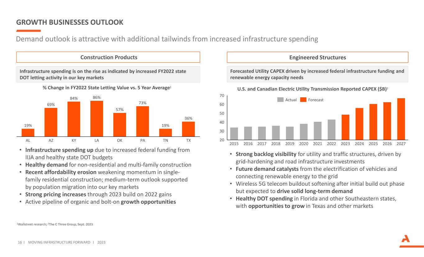 GROWTH BUSINESSES OUTLOOK Demand outlook is attractive with additional tailwinds from increased infrastructure spending Engineered Structures • Infrastructure spending up due to increased federal funding from IIJA and healthy state DOT budgets • Healthy demand for non-residential and multi-family construction • Recent affordability erosion weakening momentum in single- family residential construction; medium-term outlook supported by population migration into our key markets • Strong pricing increases through 2023 build on 2022 gains • Active pipeline of organic and bolt-on growth opportunities • Strong backlog visibility for utility and traffic structures, driven by grid-hardening and road infrastructure investments • Future demand catalysts from the electrification of vehicles and connecting renewable energy to the grid • Wireless 5G telecom buildout softening after initial build out phase but expected to drive solid long-term demand • Healthy DOT spending in Florida and other Southeastern states, with opportunities to grow in Texas and other markets 16 I MOVING INFRASTRUCTURE FORWARD I 2023 Infrastructure spending is on the rise as indicated by increased FY2022 state DOT letting activity in our key markets % Change in FY2022 State Letting Value vs. 5 Year Average1 30 60 20 40 50 70 2018 2019 20222015 2016 2017 2020 2021 2023 2024 2025 2026 2027 Actual Forecast U.S. and Canadian Electric Utility Transmission Reported CAPEX ($B)2 Forecasted Utility CAPEX driven by increased federal infrastructure funding and renewable energy capacity needs 1Wallstreet research; 2The C Three Group, Sept. 2023 Construction Products 19% 69% 84% 86% 57% 73% 19% 36% AL TXAZ KY PALA OK TN