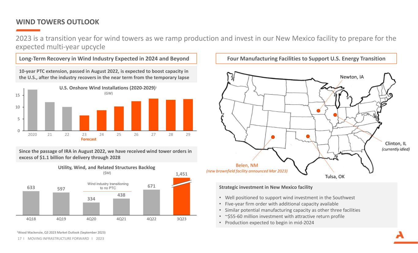 WIND TOWERS OUTLOOK Long-Term Recovery in Wind Industry Expected in 2024 and Beyond 0 5 10 15 2826242020 21 2322 2725 29 U.S. Onshore Wind Installations (2020-2029)1 (GW) Forecast 10-year PTC extension, passed in August 2022, is expected to boost capacity in the U.S., after the industry recovers in the near term from the temporary lapse Since the passage of IRA in August 2022, we have received wind tower orders in excess of $1.1 billion for delivery through 2028 633 597 334 438 671 4Q214Q18 4Q19 3Q234Q20 4Q22 1,451 Utility, Wind, and Related Structures Backlog ($M) Wind industry transitioning to no PTC Four Manufacturing Facilities to Support U.S. Energy Transition Newton, IA Clinton, IL (currently idled) Tulsa, OK Belen, NM (new brownfield facility announced Mar 2023) 2023 is a transition year for wind towers as we ramp production and invest in our New Mexico facility to prepare for the expected multi-year upcycle Strategic investment in New Mexico facility • Well positioned to support wind investment in the Southwest • Five-year firm order with additional capacity available • Similar potential manufacturing capacity as other three facilities • ~$55-60 million investment with attractive return profile • Production expected to begin in mid-2024 17 I MOVING INFRASTRUCTURE FORWARD I 2023 1Wood Mackenzie, Q3 2023 Market Outlook (September 2023)
