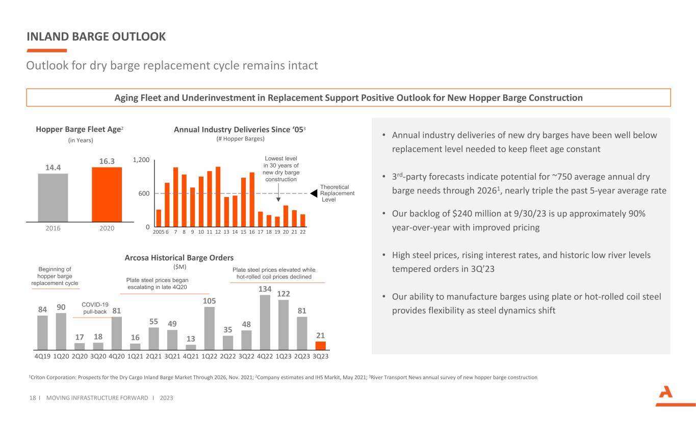 INLAND BARGE OUTLOOK 18 I MOVING INFRASTRUCTURE FORWARD I 2023 84 90 17 18 81 16 55 49 13 105 35 48 134 122 81 21 4Q223Q211Q20 1Q234Q19 3Q20 1Q212Q20 4Q20 2Q21 4Q21 1Q22 2Q22 3Q22 2Q23 3Q23 14.4 16.3 2016 2020 Hopper Barge Fleet Age2 (in Years) 0 600 1,200 6 162005 97 8 10 11 12 201713 14 15 18 2119 22 Theoretical Replacement Level Annual Industry Deliveries Since ‘053 (# Hopper Barges) Lowest level in 30 years of new dry barge construction Arcosa Historical Barge Orders ($M) COVID-19 pull-back Plate steel prices elevated while hot-rolled coil prices declined Plate steel prices began escalating in late 4Q20 Beginning of hopper barge replacement cycle Outlook for dry barge replacement cycle remains intact 1Criton Corporation: Prospects for the Dry Cargo Inland Barge Market Through 2026, Nov. 2021; 2Company estimates and IHS Markit, May 2021; 3River Transport News annual survey of new hopper barge construction • Annual industry deliveries of new dry barges have been well below replacement level needed to keep fleet age constant • 3rd-party forecasts indicate potential for ~750 average annual dry barge needs through 20261, nearly triple the past 5-year average rate • Our backlog of $240 million at 9/30/23 is up approximately 90% year-over-year with improved pricing • High steel prices, rising interest rates, and historic low river levels tempered orders in 3Q’23 • Our ability to manufacture barges using plate or hot-rolled coil steel provides flexibility as steel dynamics shift Aging Fleet and Underinvestment in Replacement Support Positive Outlook for New Hopper Barge Construction
