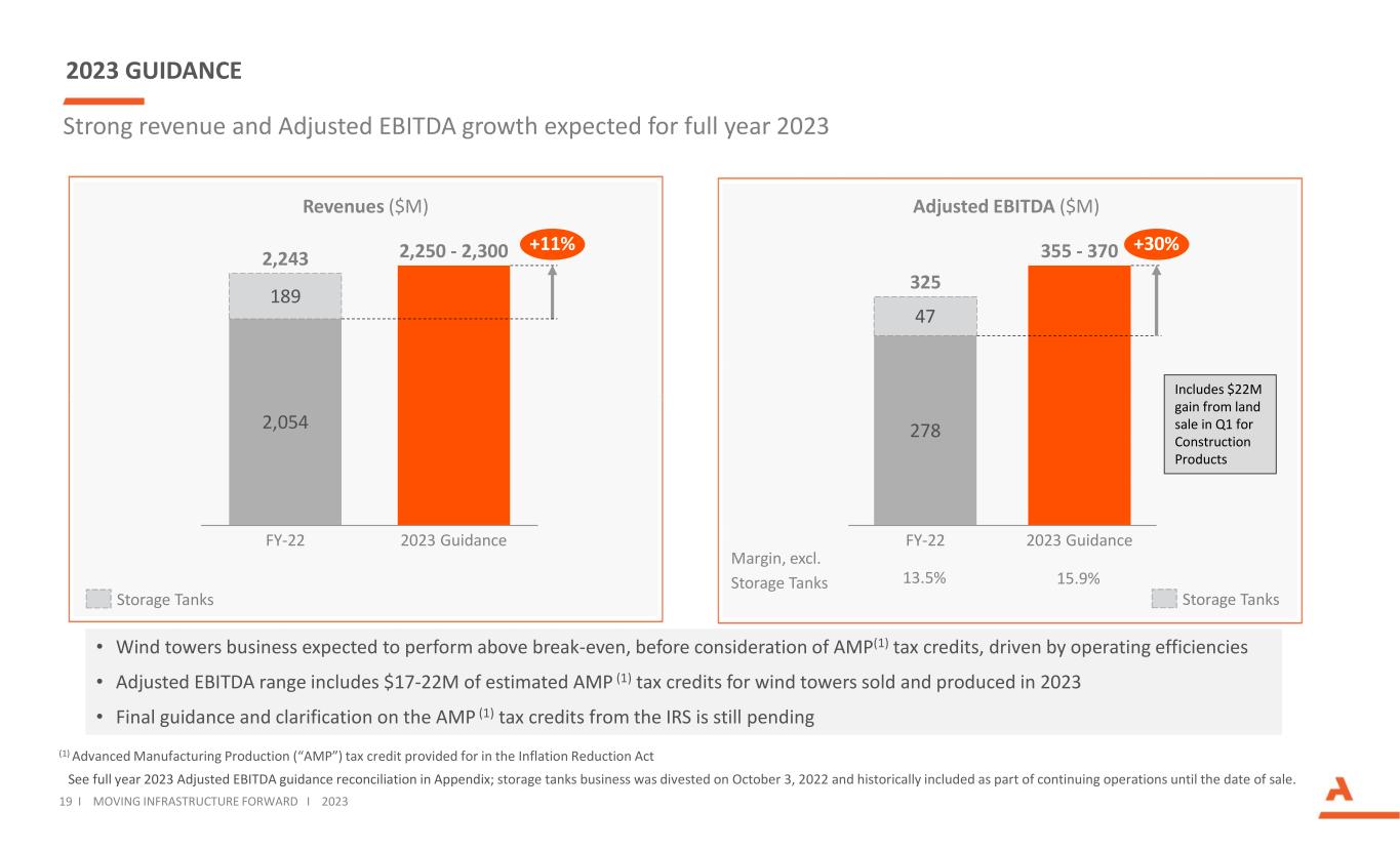 Strong revenue and Adjusted EBITDA growth expected for full year 2023 See full year 2023 Adjusted EBITDA guidance reconciliation in Appendix; storage tanks business was divested on October 3, 2022 and historically included as part of continuing operations until the date of sale. 2023 GUIDANCE 278 47 FY-22 2023 Guidance 325 355 - 370 +30% Adjusted EBITDA ($M) Storage Tanks 19 I MOVING INFRASTRUCTURE FORWARD I 2023 Margin, excl. Storage Tanks 13.5% 15.9% • Wind towers business expected to perform above break-even, before consideration of AMP(1) tax credits, driven by operating efficiencies • Adjusted EBITDA range includes $17-22M of estimated AMP (1) tax credits for wind towers sold and produced in 2023 • Final guidance and clarification on the AMP (1) tax credits from the IRS is still pending 2,054 189 2023 GuidanceFY-22 2,243 2,250 - 2,300 +11% Storage Tanks Revenues ($M) (1) Advanced Manufacturing Production (“AMP”) tax credit provided for in the Inflation Reduction Act Includes $22M gain from land sale in Q1 for Construction Products