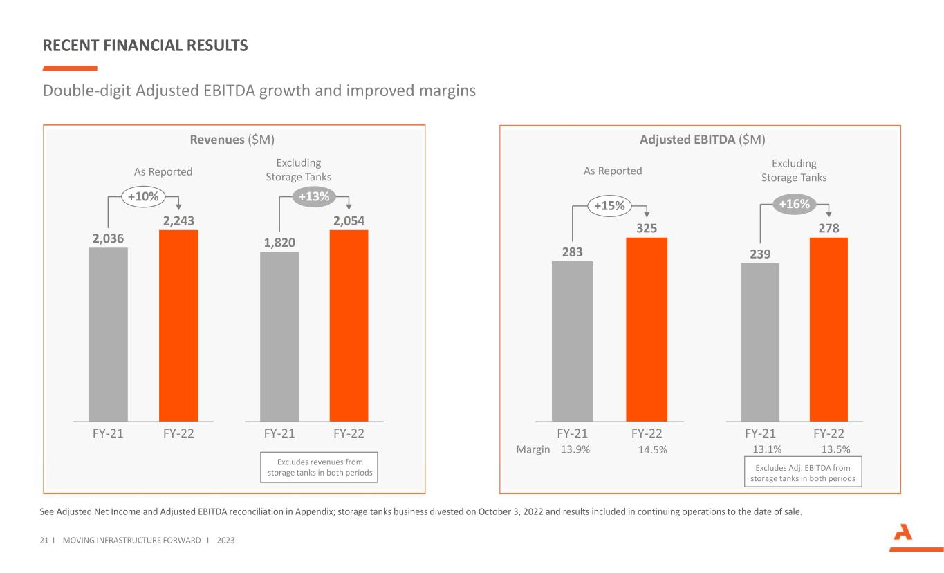 RECENT FINANCIAL RESULTS See Adjusted Net Income and Adjusted EBITDA reconciliation in Appendix; storage tanks business divested on October 3, 2022 and results included in continuing operations to the date of sale. Revenues ($M) Adjusted EBITDA ($M) 2,036 2,243 FY-22FY-21 +10% Double-digit Adjusted EBITDA growth and improved margins 21 I MOVING INFRASTRUCTURE FORWARD I 2023 1,820 2,054 FY-22FY-21 +13% As Reported Excluding Storage Tanks 283 325 FY-22FY-21 +15% 239 278 FY-21 FY-22 +16% As Reported Excluding Storage Tanks Margin 13.9% 13.5%13.1%14.5% Excludes revenues from storage tanks in both periods Excludes Adj. EBITDA from storage tanks in both periods