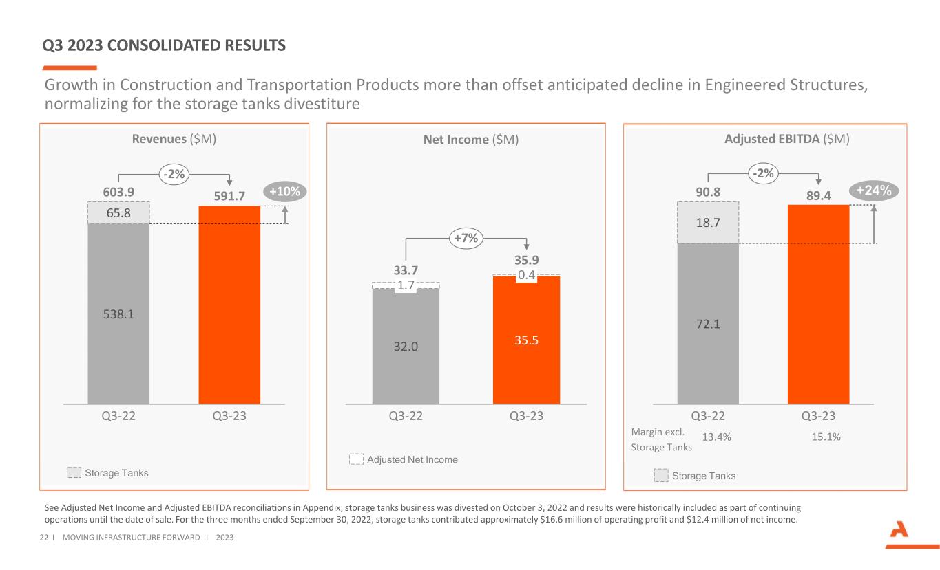 Q3 2023 CONSOLIDATED RESULTS See Adjusted Net Income and Adjusted EBITDA reconciliations in Appendix; storage tanks business was divested on October 3, 2022 and results were historically included as part of continuing operations until the date of sale. For the three months ended September 30, 2022, storage tanks contributed approximately $16.6 million of operating profit and $12.4 million of net income. Revenues ($M) Adjusted EBITDA ($M) 538.1 65.8 Q3-22 Q3-23 603.9 591.7 +10% -2% Net Income ($M) Growth in Construction and Transportation Products more than offset anticipated decline in Engineered Structures, normalizing for the storage tanks divestiture 22 I MOVING INFRASTRUCTURE FORWARD I 2023 72.1 89.4 18.7 Q3-22 Q3-23 90.8 +24% -2% Margin excl. Storage Tanks 13.4% 15.1% 32.0 35.5 1.7 Q3-23Q3-22 33.7 35.9 0.4 +7% Storage Tanks Adjusted Net Income Storage Tanks