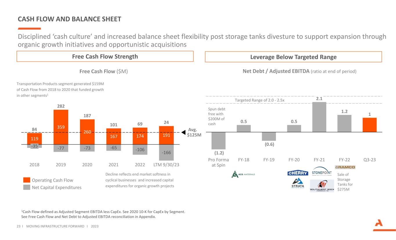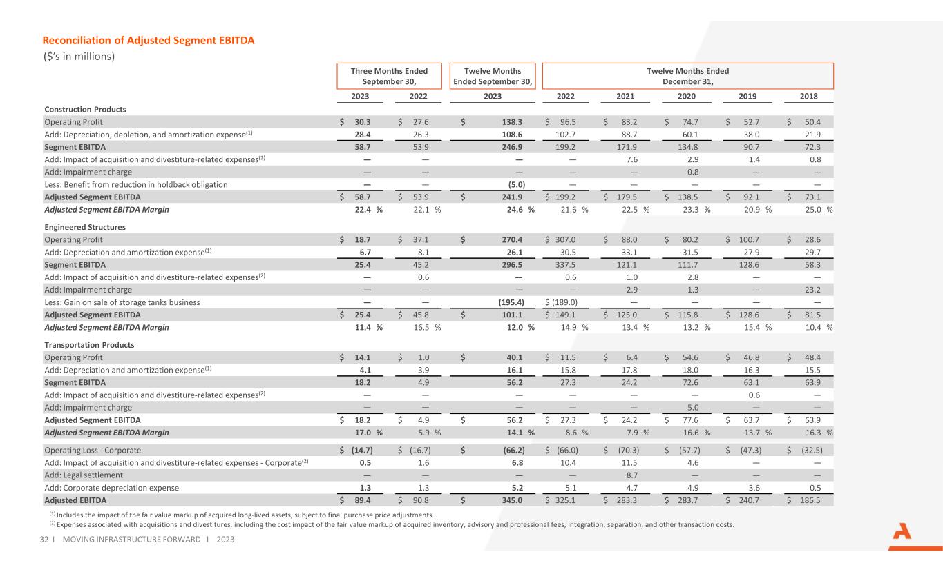 Reconciliation of Adjusted Segment EBITDA ($’s in millions) (unaudited) (1) Includes the impact of the fair value markup of acquired long-lived assets, subject to final purchase price adjustments. (2) Expenses associated with acquisitions and divestitures, including the cost impact of the fair value markup of acquired inventory, advisory and professional fees, integration, separation, and other transaction costs. 32 I MOVING INFRASTRUCTURE FORWARD I 2023 Three Months Ended September 30, Twelve Months Ended September 30, Twelve Months Ended December 31, 2023 2022 2023 2022 2021 2020 2019 2018 Construction Products Operating Profit $ 30.3 $ 27.6 $ 138.3 $ 96.5 $ 83.2 $ 74.7 $ 52.7 $ 50.4 Add: Depreciation, depletion, and amortization expense(1) 28.4 26.3 108.6 102.7 88.7 60.1 38.0 21.9 Segment EBITDA 58.7 53.9 246.9 199.2 171.9 134.8 90.7 72.3 Add: Impact of acquisition and divestiture-related expenses(2) — — — — 7.6 2.9 1.4 0.8 Add: Impairment charge — — — — — 0.8 — — Less: Benefit from reduction in holdback obligation — — (5.0) — — — — — Adjusted Segment EBITDA $ 58.7 $ 53.9 $ 241.9 $ 199.2 $ 179.5 $ 138.5 $ 92.1 $ 73.1 Adjusted Segment EBITDA Margin 22.4 % 22.1 % 24.6 % 21.6 % 22.5 % 23.3 % 20.9 % 25.0 % Engineered Structures Operating Profit $ 18.7 $ 37.1 $ 270.4 $ 307.0 $ 88.0 $ 80.2 $ 100.7 $ 28.6 Add: Depreciation and amortization expense(1) 6.7 8.1 26.1 30.5 33.1 31.5 27.9 29.7 Segment EBITDA 25.4 45.2 296.5 337.5 121.1 111.7 128.6 58.3 Add: Impact of acquisition and divestiture-related expenses(2) — 0.6 — 0.6 1.0 2.8 — — Add: Impairment charge — — — — 2.9 1.3 — 23.2 Less: Gain on sale of storage tanks business — — (195.4) $ (189.0) — — — — Adjusted Segment EBITDA $ 25.4 $ 45.8 $ 101.1 $ 149.1 $ 125.0 $ 115.8 $ 128.6 $ 81.5 Adjusted Segment EBITDA Margin 11.4 % 16.5 % 12.0 % 14.9 % 13.4 % 13.2 % 15.4 % 10.4 % Transportation Products Operating Profit $ 14.1 $ 1.0 $ 40.1 $ 11.5 $ 6.4 $ 54.6 $ 46.8 $ 48.4 Add: Depreciation and amortization expense(1) 4.1 3.9 16.1 15.8 17.8 18.0 16.3 15.5 Segment EBITDA 18.2 4.9 56.2 27.3 24.2 72.6 63.1 63.9 Add: Impact of acquisition and divestiture-related expenses(2) — — — — — — 0.6 — Add: Impairment charge — — — — — 5.0 — — Adjusted Segment EBITDA $ 18.2 $ 4.9 $ 56.2 $ 27.3 $ 24.2 $ 77.6 $ 63.7 $ 63.9 Adjusted Segment EBITDA Margin 17.0 % 5.9 % 14.1 % 8.6 % 7.9 % 16.6 % 13.7 % 16.3 % Operating Loss - Corporate $ (14.7) $ (16.7) $ (66.2) $ (66.0) $ (70.3) $ (57.7) $ (47.3) $ (32.5) Add: Impact of acquisition and divestiture-related expenses - Corporate(2) 0.5 1.6 6.8 10.4 11.5 4.6 — — Add: Legal settlement — — — — 8.7 — — — Add: Corporate depreciation expense 1.3 1.3 5.2 5.1 4.7 4.9 3.6 0.5 Adjusted EBITDA $ 89.4 $ 90.8 $ 345.0 $ 325.1 $ 283.3 $ 283.7 $ 240.7 $ 186.5