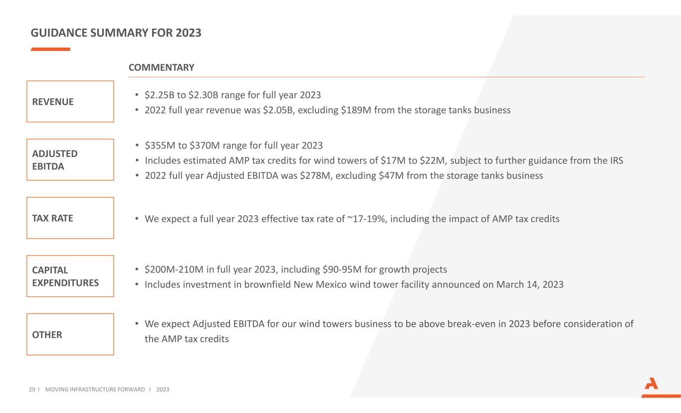 GUIDANCE SUMMARY FOR 2023 ADJUSTED EBITDA COMMENTARY CAPITAL EXPENDITURES OTHER • $355M to $370M range for full year 2023 • Includes estimated AMP tax credits for wind towers of $17M to $22M, subject to further guidance from the IRS • 2022 full year Adjusted EBITDA was $278M, excluding $47M from the storage tanks business • $200M-210M in full year 2023, including $90-95M for growth projects • Includes investment in brownfield New Mexico wind tower facility announced on March 14, 2023 TAX RATE • We expect Adjusted EBITDA for our wind towers business to be above break-even in 2023 before consideration of the AMP tax credits • We expect a full year 2023 effective tax rate of ~17-19%, including the impact of AMP tax credits REVENUE • $2.25B to $2.30B range for full year 2023 • 2022 full year revenue was $2.05B, excluding $189M from the storage tanks business 29 I MOVING INFRASTRUCTURE FORWARD I 2023