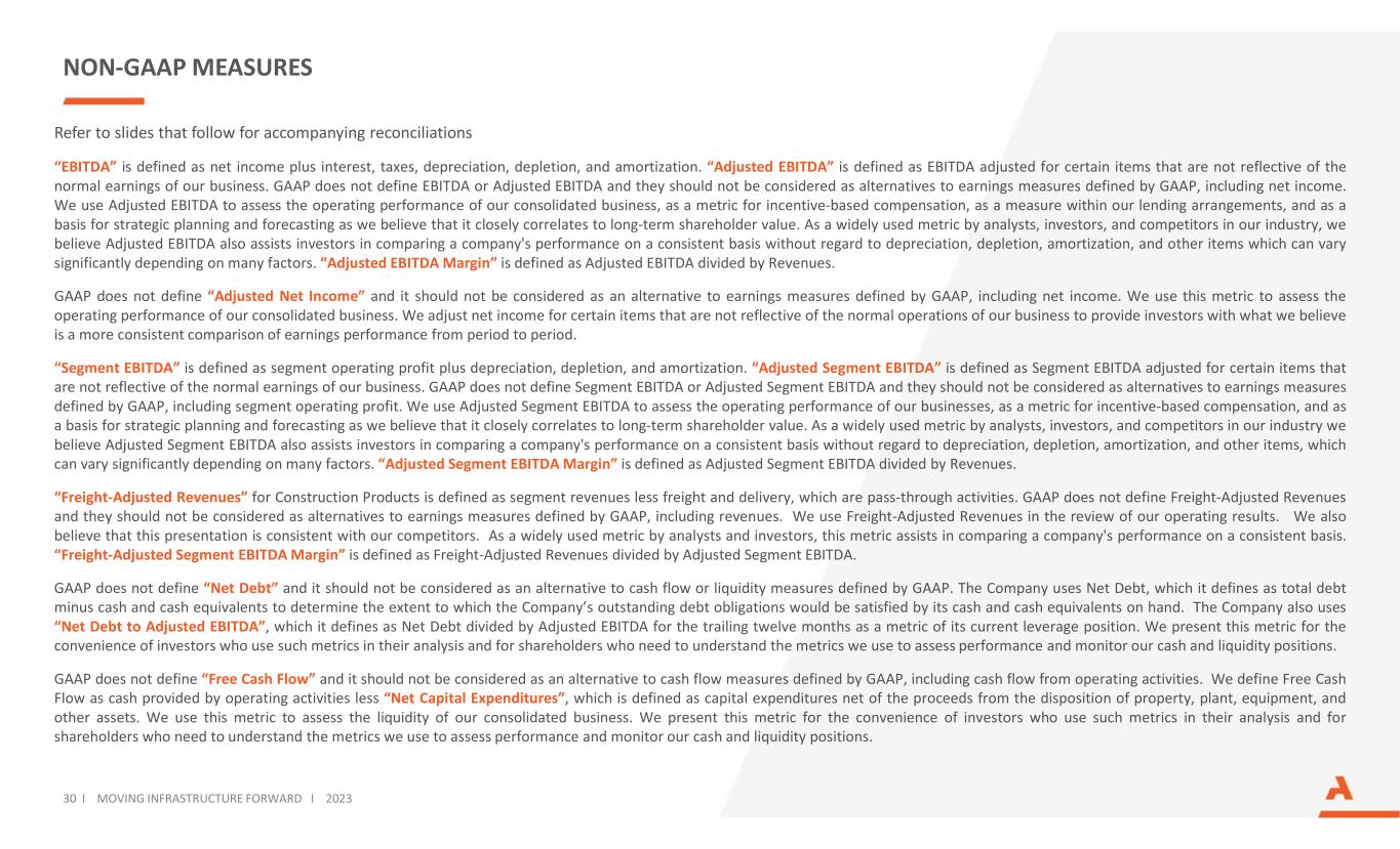 NON-GAAP MEASURES Refer to slides that follow for accompanying reconciliations “EBITDA” is defined as net income plus interest, taxes, depreciation, depletion, and amortization. “Adjusted EBITDA” is defined as EBITDA adjusted for certain items that are not reflective of the normal earnings of our business. GAAP does not define EBITDA or Adjusted EBITDA and they should not be considered as alternatives to earnings measures defined by GAAP, including net income. We use Adjusted EBITDA to assess the operating performance of our consolidated business, as a metric for incentive-based compensation, as a measure within our lending arrangements, and as a basis for strategic planning and forecasting as we believe that it closely correlates to long-term shareholder value. As a widely used metric by analysts, investors, and competitors in our industry, we believe Adjusted EBITDA also assists investors in comparing a company's performance on a consistent basis without regard to depreciation, depletion, amortization, and other items which can vary significantly depending on many factors. “Adjusted EBITDA Margin” is defined as Adjusted EBITDA divided by Revenues. GAAP does not define “Adjusted Net Income” and it should not be considered as an alternative to earnings measures defined by GAAP, including net income. We use this metric to assess the operating performance of our consolidated business. We adjust net income for certain items that are not reflective of the normal operations of our business to provide investors with what we believe is a more consistent comparison of earnings performance from period to period. “Segment EBITDA” is defined as segment operating profit plus depreciation, depletion, and amortization. “Adjusted Segment EBITDA” is defined as Segment EBITDA adjusted for certain items that are not reflective of the normal earnings of our business. GAAP does not define Segment EBITDA or Adjusted Segment EBITDA and they should not be considered as alternatives to earnings measures defined by GAAP, including segment operating profit. We use Adjusted Segment EBITDA to assess the operating performance of our businesses, as a metric for incentive-based compensation, and as a basis for strategic planning and forecasting as we believe that it closely correlates to long-term shareholder value. As a widely used metric by analysts, investors, and competitors in our industry we believe Adjusted Segment EBITDA also assists investors in comparing a company's performance on a consistent basis without regard to depreciation, depletion, amortization, and other items, which can vary significantly depending on many factors. “Adjusted Segment EBITDA Margin” is defined as Adjusted Segment EBITDA divided by Revenues. “Freight-Adjusted Revenues” for Construction Products is defined as segment revenues less freight and delivery, which are pass-through activities. GAAP does not define Freight-Adjusted Revenues and they should not be considered as alternatives to earnings measures defined by GAAP, including revenues. We use Freight-Adjusted Revenues in the review of our operating results. We also believe that this presentation is consistent with our competitors. As a widely used metric by analysts and investors, this metric assists in comparing a company's performance on a consistent basis. “Freight-Adjusted Segment EBITDA Margin” is defined as Freight-Adjusted Revenues divided by Adjusted Segment EBITDA. GAAP does not define “Net Debt” and it should not be considered as an alternative to cash flow or liquidity measures defined by GAAP. The Company uses Net Debt, which it defines as total debt minus cash and cash equivalents to determine the extent to which the Company’s outstanding debt obligations would be satisfied by its cash and cash equivalents on hand. The Company also uses “Net Debt to Adjusted EBITDA”, which it defines as Net Debt divided by Adjusted EBITDA for the trailing twelve months as a metric of its current leverage position. We present this metric for the convenience of investors who use such metrics in their analysis and for shareholders who need to understand the metrics we use to assess performance and monitor our cash and liquidity positions. GAAP does not define “Free Cash Flow” and it should not be considered as an alternative to cash flow measures defined by GAAP, including cash flow from operating activities. We define Free Cash Flow as cash provided by operating activities less “Net Capital Expenditures”, which is defined as capital expenditures net of the proceeds from the disposition of property, plant, equipment, and other assets. We use this metric to assess the liquidity of our consolidated business. We present this metric for the convenience of investors who use such metrics in their analysis and for shareholders who need to understand the metrics we use to assess performance and monitor our cash and liquidity positions. 30 I MOVING INFRASTRUCTURE FORWARD I 2023