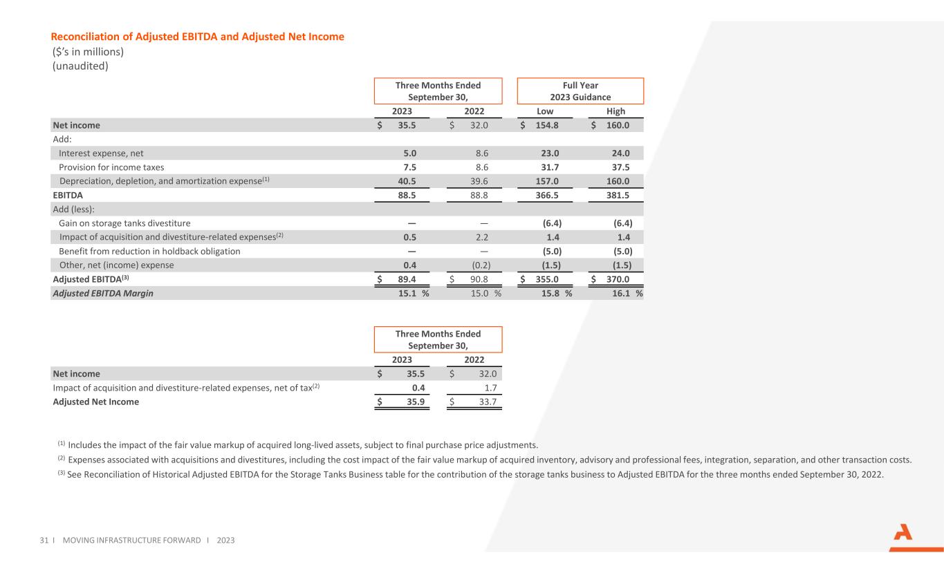 Reconciliation of Adjusted EBITDA and Adjusted Net Income ($’s in millions) (unaudited) 31 I MOVING INFRASTRUCTURE FORWARD I 2023 (1) Includes the impact of the fair value markup of acquired long-lived assets, subject to final purchase price adjustments. (2) Expenses associated with acquisitions and divestitures, including the cost impact of the fair value markup of acquired inventory, advisory and professional fees, integration, separation, and other transaction costs. (3) See Reconciliation of Historical Adjusted EBITDA for the Storage Tanks Business table for the contribution of the storage tanks business to Adjusted EBITDA for the three months ended September 30, 2022. Three Months Ended September 30, Full Year 2023 Guidance 2023 2022 Low High Net income $ 35.5 $ 32.0 $ 154.8 $ 160.0 Add: Interest expense, net 5.0 8.6 23.0 24.0 Provision for income taxes 7.5 8.6 31.7 37.5 Depreciation, depletion, and amortization expense(1) 40.5 39.6 157.0 160.0 EBITDA 88.5 88.8 366.5 381.5 Add (less): Gain on storage tanks divestiture — — (6.4) (6.4) Impact of acquisition and divestiture-related expenses(2) 0.5 2.2 1.4 1.4 Benefit from reduction in holdback obligation — — (5.0) (5.0) Other, net (income) expense 0.4 (0.2) (1.5) (1.5) Adjusted EBITDA(3) $ 89.4 $ 90.8 $ 355.0 $ 370.0 Adjusted EBITDA Margin 15.1 % 15.0 % 15.8 % 16.1 % Three Months Ended September 30, 2023 2022 Net income $ 35.5 $ 32.0 Impact of acquisition and divestiture-related expenses, net of tax(2) 0.4 1.7 Adjusted Net Income $ 35.9 $ 33.7