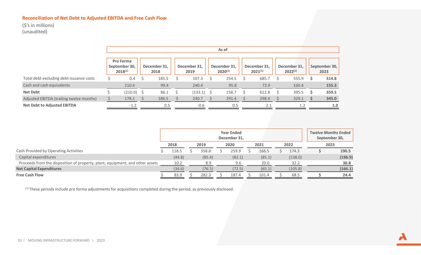 Reconciliation of Net Debt to Adjusted EBITDA and Free Cash Flow ($’s in millions) (unaudited) 33 I MOVING INFRASTRUCTURE FORWARD I 2023 (1) These periods include pro forma adjustments for acquisitions completed during the period, as previously disclosed. As of Pro Forma September 30, 2018(1) December 31, 2018 December 31, 2019 December 31, 2020(1) December 31, 2021(1) December 31, 2022(1) September 30, 2023 Total debt excluding debt issuance costs $ 0.4 $ 185.5 $ 107.3 $ 254.5 $ 685.7 $ 555.9 $ 514.8 Cash and cash equivalents 210.4 99.4 240.4 95.8 72.9 160.4 155.3 Net Debt $ (210.0) $ 86.1 $ (133.1) $ 158.7 $ 612.8 $ 395.5 $ 359.5 Adjusted EBITDA (trailing twelve months) $ 178.1 $ 186.5 $ 240.7 $ 291.4 $ 298.4 $ 329.1 $ 345.0 Net Debt to Adjusted EBITDA -1.2 0.5 -0.6 0.5 2.1 1.2 1.0 Year Ended December 31, Twelve Months Ended September 30, 2018 2019 2020 2021 2022 2023 Cash Provided by Operating Activities $ 118.5 $ 358.8 $ 259.9 $ 166.5 $ 174.3 $ 190.5 Capital expenditures (44.8) (85.4) (82.1) (85.1) (138.0) (196.9) Proceeds from the disposition of property, plant, equipment, and other assets 10.2 8.9 9.6 20.0 32.2 30.8 Net Capital Expenditures (34.6) (76.5) (72.5) (65.1) (105.8) (166.1) Free Cash Flow $ 83.9 $ 282.3 $ 187.4 $ 101.4 $ 68.5 $ 24.4