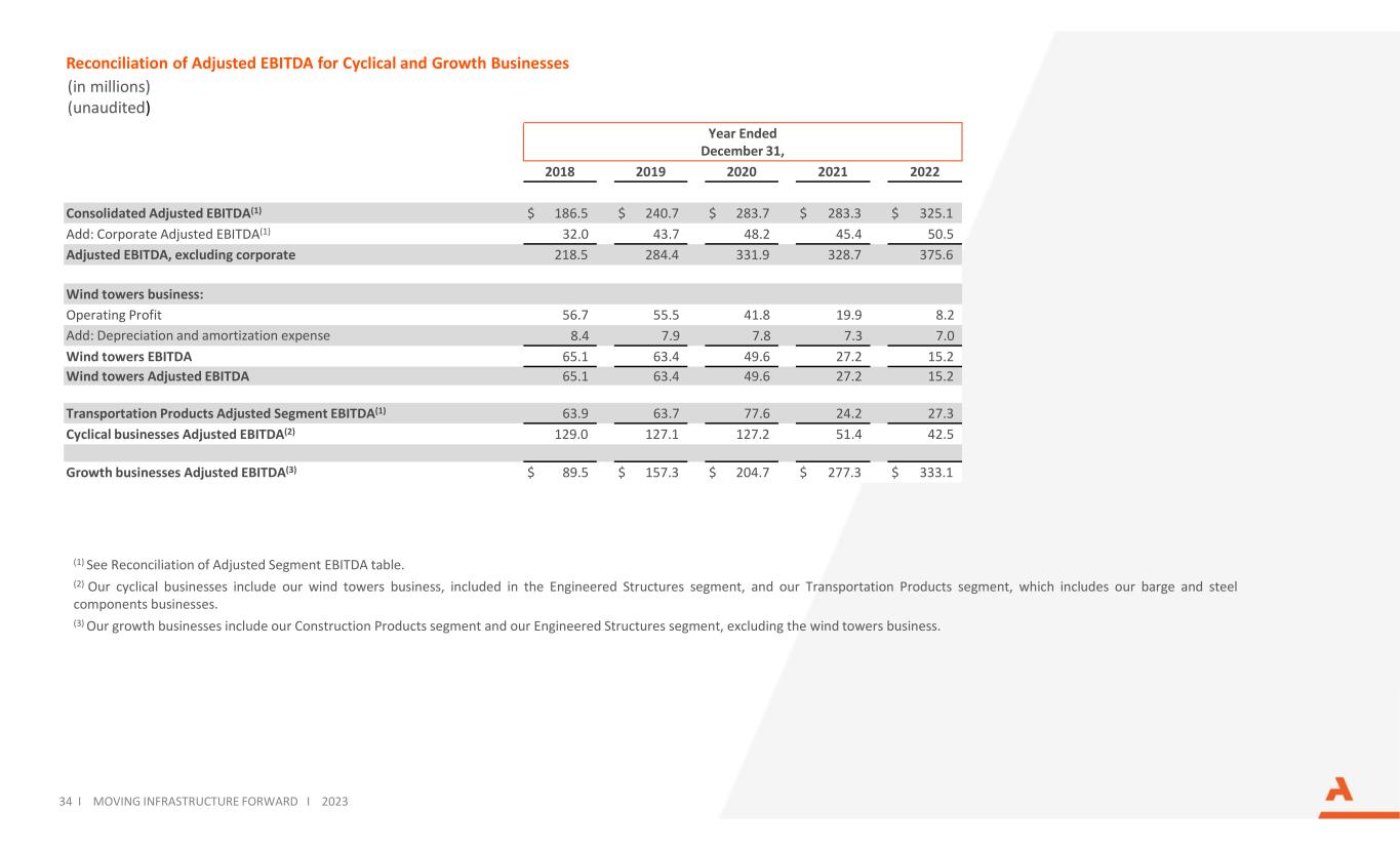 Reconciliation of Adjusted EBITDA for Cyclical and Growth Businesses (in millions) (unaudited) 34 I MOVING INFRASTRUCTURE FORWARD I 2023 Year Ended December 31, 2018 2019 2020 2021 2022 Consolidated Adjusted EBITDA(1) $ 186.5 $ 240.7 $ 283.7 $ 283.3 $ 325.1 Add: Corporate Adjusted EBITDA(1) 32.0 43.7 48.2 45.4 50.5 Adjusted EBITDA, excluding corporate 218.5 284.4 331.9 328.7 375.6 Wind towers business: Operating Profit 56.7 55.5 41.8 19.9 8.2 Add: Depreciation and amortization expense 8.4 7.9 7.8 7.3 7.0 Wind towers EBITDA 65.1 63.4 49.6 27.2 15.2 Wind towers Adjusted EBITDA 65.1 63.4 49.6 27.2 15.2 Transportation Products Adjusted Segment EBITDA(1) 63.9 63.7 77.6 24.2 27.3 Cyclical businesses Adjusted EBITDA(2) 129.0 127.1 127.2 51.4 42.5 Growth businesses Adjusted EBITDA(3) $ 89.5 $ 157.3 $ 204.7 $ 277.3 $ 333.1 (1) See Reconciliation of Adjusted Segment EBITDA table. (2) Our cyclical businesses include our wind towers business, included in the Engineered Structures segment, and our Transportation Products segment, which includes our barge and steel components businesses. (3) Our growth businesses include our Construction Products segment and our Engineered Structures segment, excluding the wind towers business.