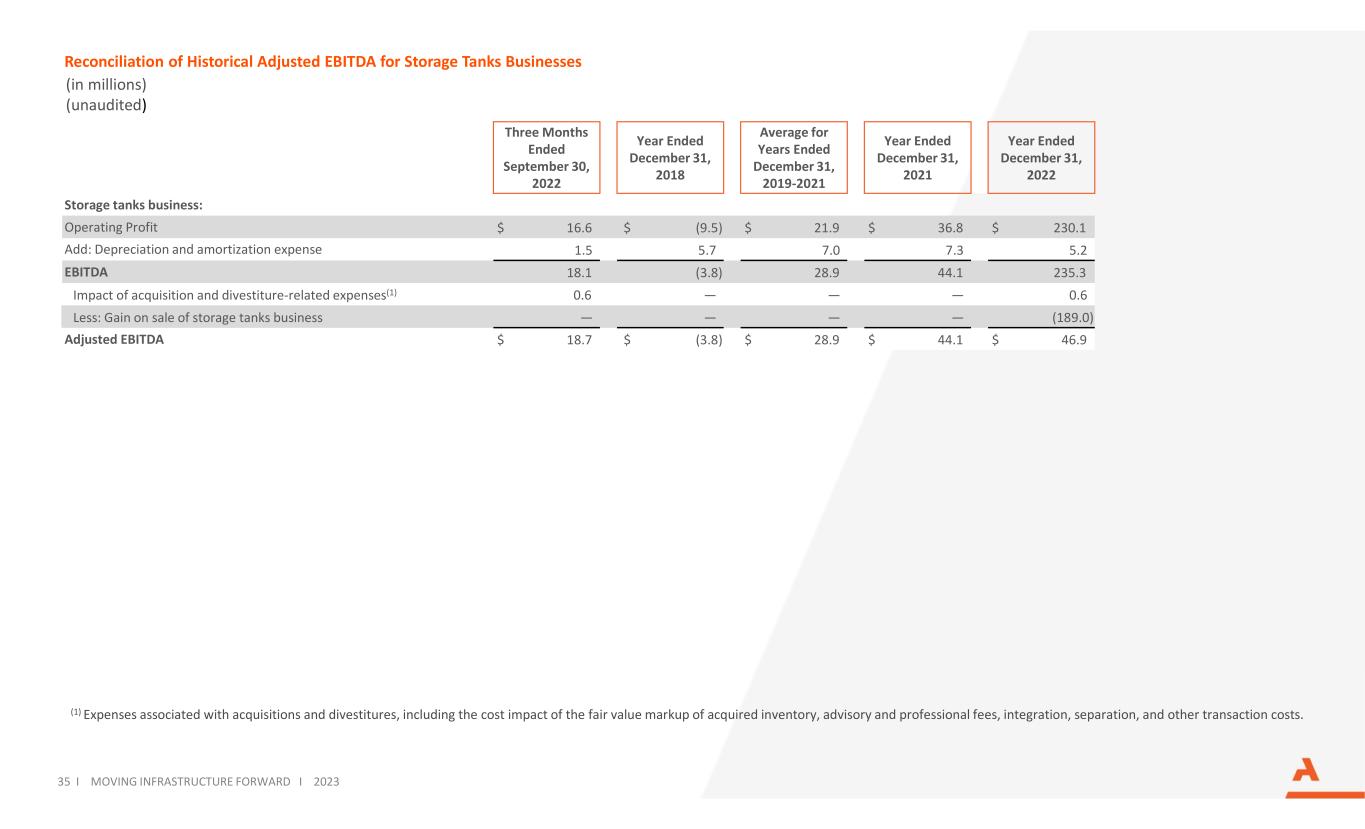 (1) Expenses associated with acquisitions and divestitures, including the cost impact of the fair value markup of acquired inventory, advisory and professional fees, integration, separation, and other transaction costs. Reconciliation of Historical Adjusted EBITDA for Storage Tanks Businesses (in millions) (unaudited) 35 I MOVING INFRASTRUCTURE FORWARD I 2023 Three Months Ended September 30, 2022 Year Ended December 31, 2018 Average for Years Ended December 31, 2019-2021 Year Ended December 31, 2021 Year Ended December 31, 2022 Storage tanks business: Operating Profit $ 16.6 $ (9.5) $ 21.9 $ 36.8 $ 230.1 Add: Depreciation and amortization expense 1.5 5.7 7.0 7.3 5.2 EBITDA 18.1 (3.8) 28.9 44.1 235.3 Impact of acquisition and divestiture-related expenses(1) 0.6 — — — 0.6 Less: Gain on sale of storage tanks business — — — — (189.0) Adjusted EBITDA $ 18.7 $ (3.8) $ 28.9 $ 44.1 $ 46.9