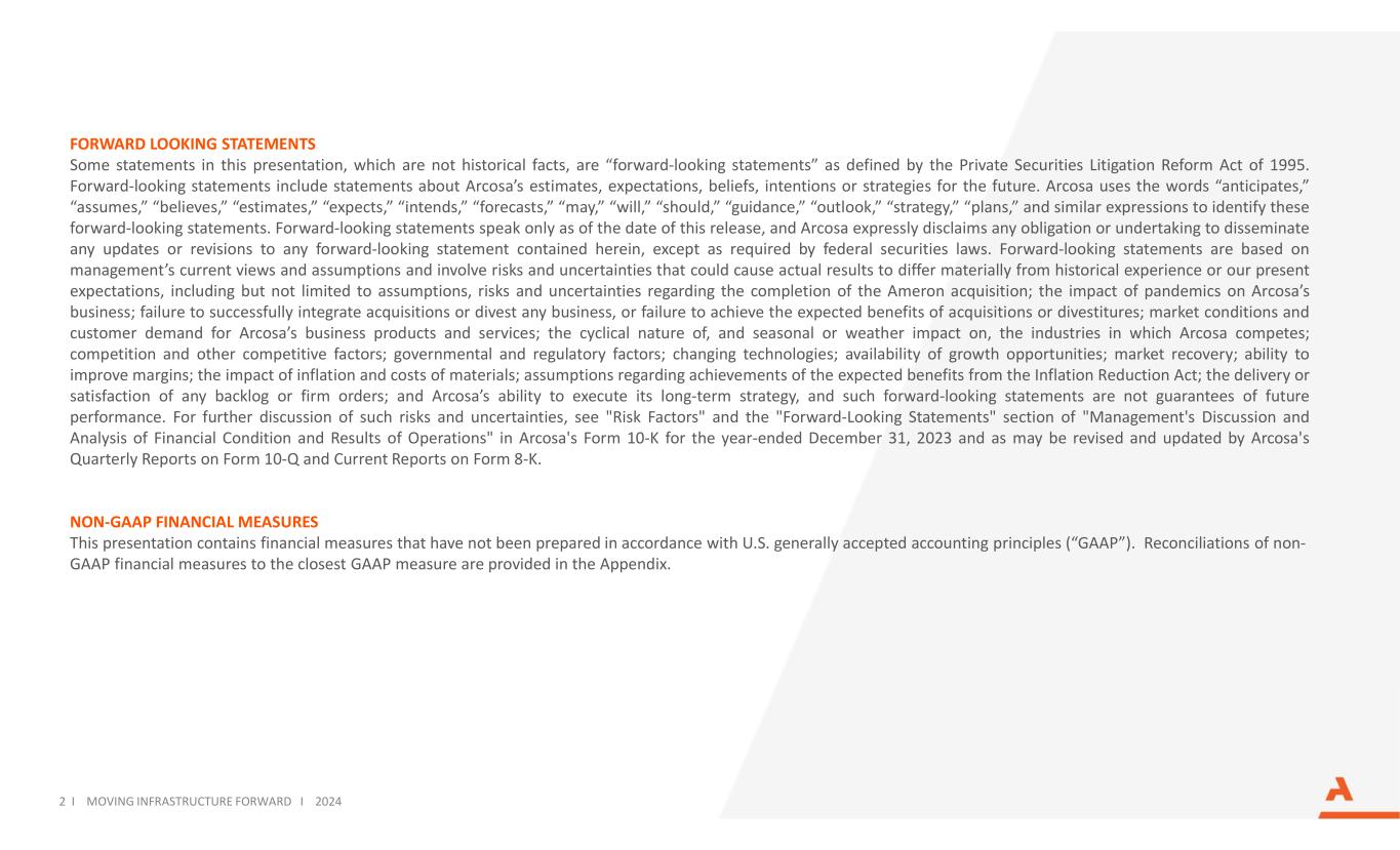 2 I MOVING INFRASTRUCTURE FORWARD I 2024 FORWARD LOOKING STATEMENTS Some statements in this presentation, which are not historical facts, are “forward-looking statements” as defined by the Private Securities Litigation Reform Act of 1995. Forward-looking statements include statements about Arcosa’s estimates, expectations, beliefs, intentions or strategies for the future. Arcosa uses the words “anticipates,” “assumes,” “believes,” “estimates,” “expects,” “intends,” “forecasts,” “may,” “will,” “should,” “guidance,” “outlook,” “strategy,” “plans,” and similar expressions to identify these forward-looking statements. Forward-looking statements speak only as of the date of this release, and Arcosa expressly disclaims any obligation or undertaking to disseminate any updates or revisions to any forward-looking statement contained herein, except as required by federal securities laws. Forward-looking statements are based on management’s current views and assumptions and involve risks and uncertainties that could cause actual results to differ materially from historical experience or our present expectations, including but not limited to assumptions, risks and uncertainties regarding the completion of the Ameron acquisition; the impact of pandemics on Arcosa’s business; failure to successfully integrate acquisitions or divest any business, or failure to achieve the expected benefits of acquisitions or divestitures; market conditions and customer demand for Arcosa’s business products and services; the cyclical nature of, and seasonal or weather impact on, the industries in which Arcosa competes; competition and other competitive factors; governmental and regulatory factors; changing technologies; availability of growth opportunities; market recovery; ability to improve margins; the impact of inflation and costs of materials; assumptions regarding achievements of the expected benefits from the Inflation Reduction Act; the delivery or satisfaction of any backlog or firm orders; and Arcosa’s ability to execute its long-term strategy, and such forward-looking statements are not guarantees of future performance. For further discussion of such risks and uncertainties, see "Risk Factors" and the "Forward-Looking Statements" section of "Management's Discussion and Analysis of Financial Condition and Results of Operations" in Arcosa's Form 10-K for the year-ended December 31, 2023 and as may be revised and updated by Arcosa's Quarterly Reports on Form 10-Q and Current Reports on Form 8-K. NON-GAAP FINANCIAL MEASURES This presentation contains financial measures that have not been prepared in accordance with U.S. generally accepted accounting principles (“GAAP”). Reconciliations of non- GAAP financial measures to the closest GAAP measure are provided in the Appendix.