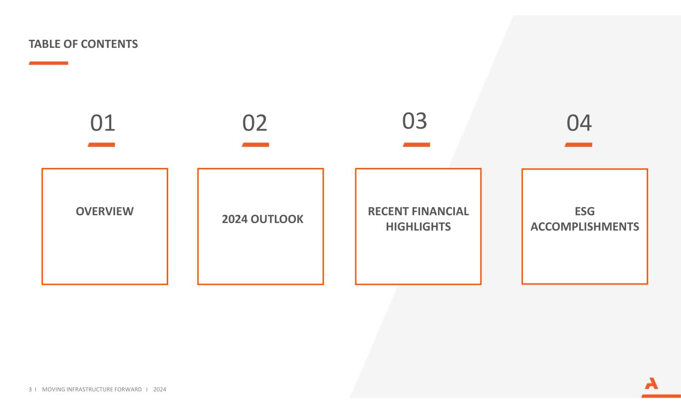 01 03 04 OVERVIEW ESG ACCOMPLISHMENTS 02 RECENT FINANCIAL HIGHLIGHTS TABLE OF CONTENTS 3 I MOVING INFRASTRUCTURE FORWARD I 2024 2024 OUTLOOK