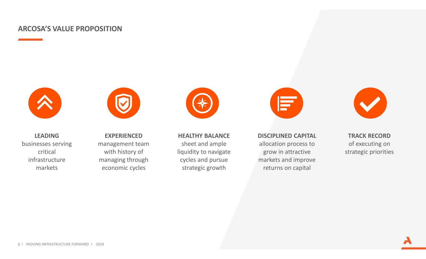 HOW TO FIND US OUR WEBSITE www.arcosa.com NYSE TICKER ACA HEADQUARTERS Arcosa, Inc. 500 North Akard Street, Suite 400 Dallas, TX 75201 INVESTOR CONTACT InvestorResources@arcosa.com 4 I MOVING INFRASTRUCTURE FORWARD I 2024