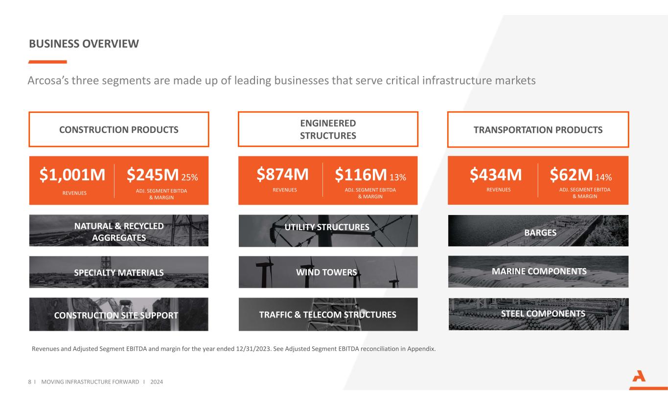 ARCOSA AT A GLANCE Revenue, net income, and Adjusted EBITDA are for the year ended 12/31/2023. See Adjusted EBITDA reconciliation in Appendix Net Income Adjusted EBITDA Infrastructure-related Segments Employees Years of Operating History OUR THREE BUSINESS SEGMENTS Revenues$2.3B $159M $368M ~6,075 85+ 3 7 I MOVING INFRASTRUCTURE FORWARD I 2024