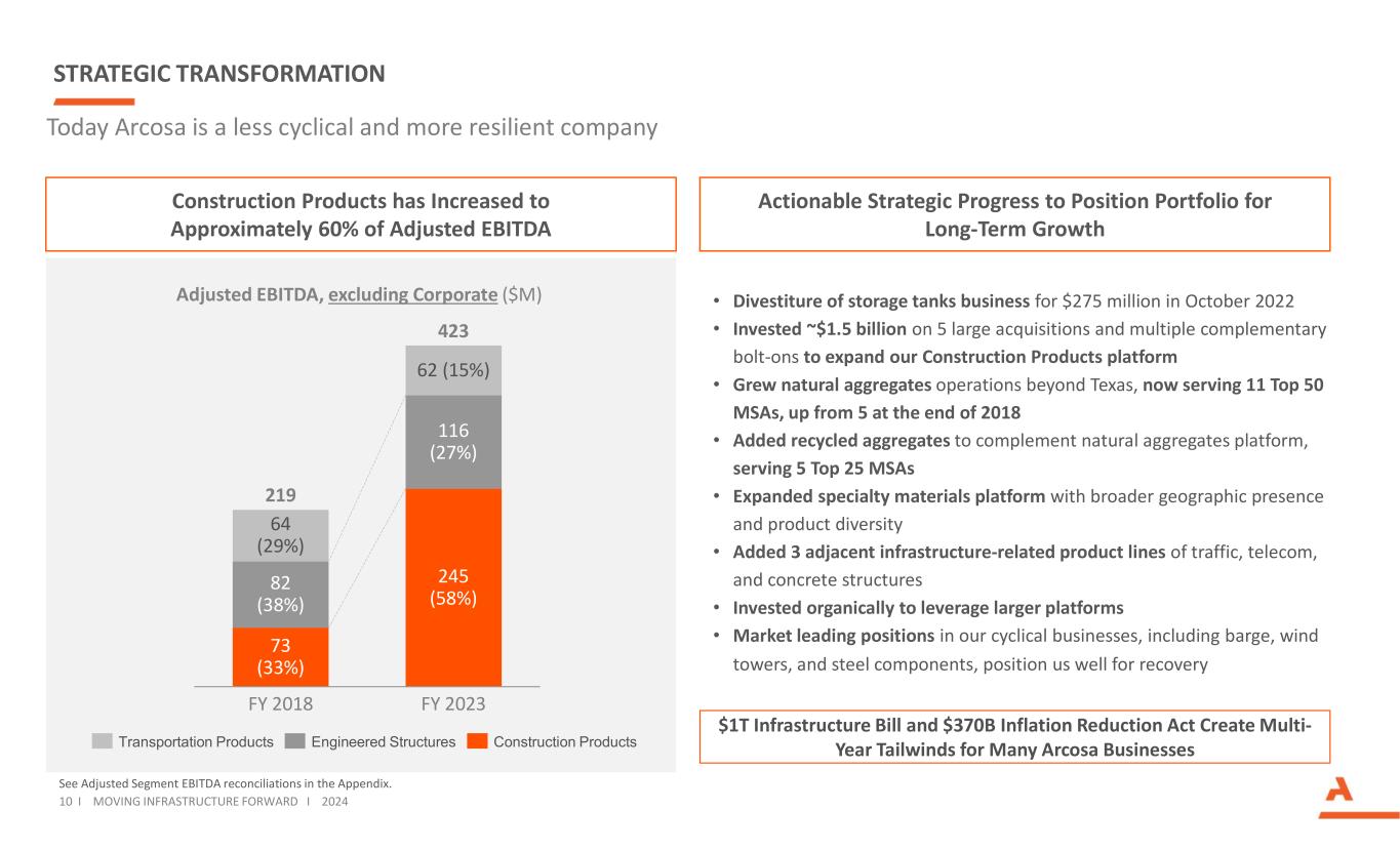 ARCOSA’S LONG-TERM VISION Grow in attractive markets where we can achieve sustainable competitive advantages Reduce the complexity and cyclicality of the overall business Improve long-term returns on invested capital Integrate Environmental, Social, and Governance (ESG) initiatives into our long-term strategy 9 I MOVING INFRASTRUCTURE FORWARD I 2024