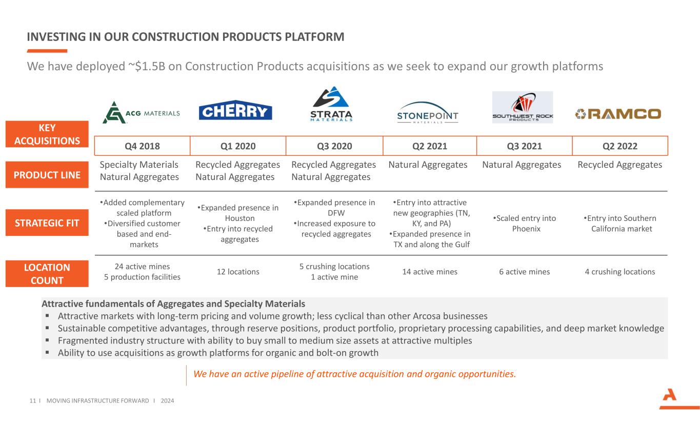 STRATEGIC TRANSFORMATION Adjusted EBITDA, excluding Corporate ($M) 64 (29%) 82 (38%) 73 (33%) FY 2018 62 (15%) 116 (27%) 245 (58%) FY 2023 219 423 See Adjusted Segment EBITDA reconciliations in the Appendix. Construction Products has Increased to Approximately 60% of Adjusted EBITDA • Divestiture of storage tanks business for $275 million in October 2022 • Invested ~$1.5 billion on 5 large acquisitions and multiple complementary bolt-ons to expand our Construction Products platform • Grew natural aggregates operations beyond Texas, now serving 11 Top 50 MSAs, up from 5 at the end of 2018 • Added recycled aggregates to complement natural aggregates platform, serving 5 Top 25 MSAs • Expanded specialty materials platform with broader geographic presence and product diversity • Added 3 adjacent infrastructure-related product lines of traffic, telecom, and concrete structures • Invested organically to leverage larger platforms • Market leading positions in our cyclical businesses, including barge, wind towers, and steel components, position us well for recovery $1T Infrastructure Bill and $370B Inflation Reduction Act Create Multi- Year Tailwinds for Many Arcosa Businesses Actionable Strategic Progress to Position Portfolio for Long-Term Growth Today Arcosa is a less cyclical and more resilient company 10 I MOVING INFRASTRUCTURE FORWARD I 2024 Transportation Products Engineered Structures Construction Products