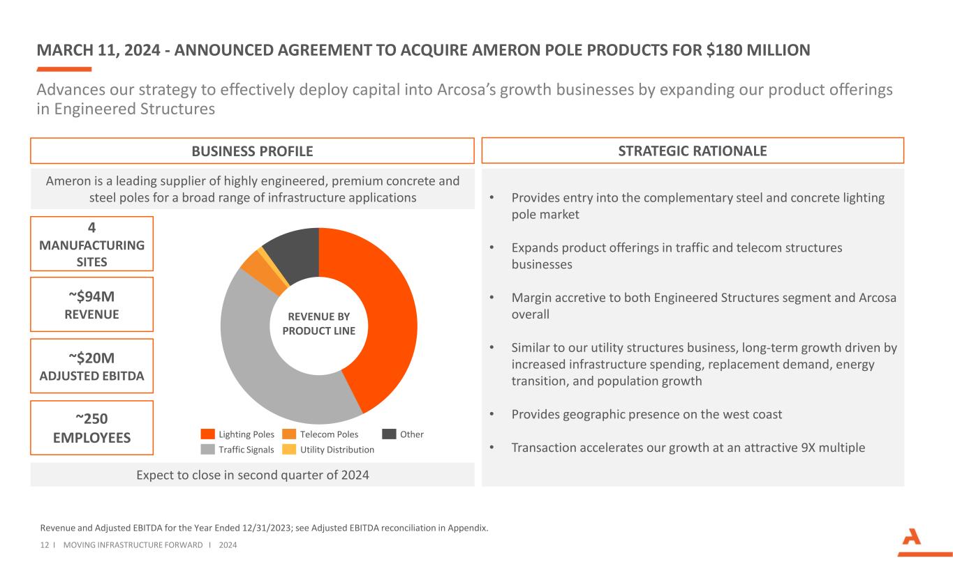 11 I MOVING INFRASTRUCTURE FORWARD I 2024 INVESTING IN OUR CONSTRUCTION PRODUCTS PLATFORM We have deployed ~$1.5B on Construction Products acquisitions as we seek to expand our growth platforms Q4 2018 Q1 2020 Q3 2020 Q2 2021 Q3 2021 Q2 2022 Specialty Materials Natural Aggregates Recycled Aggregates Natural Aggregates Recycled Aggregates Natural Aggregates Natural Aggregates Natural Aggregates Recycled Aggregates •Added complementary scaled platform •Diversified customer based and end- markets •Expanded presence in Houston •Entry into recycled aggregates •Expanded presence in DFW •Increased exposure to recycled aggregates •Entry into attractive new geographies (TN, KY, and PA) •Expanded presence in TX and along the Gulf •Scaled entry into Phoenix •Entry into Southern California market 24 active mines 5 production facilities 12 locations 5 crushing locations 1 active mine 14 active mines 6 active mines 4 crushing locations PRODUCT LINE STRATEGIC FIT LOCATION COUNT Attractive fundamentals of Aggregates and Specialty Materials  Attractive markets with long-term pricing and volume growth; less cyclical than other Arcosa businesses  Sustainable competitive advantages, through reserve positions, product portfolio, proprietary processing capabilities, and deep market knowledge  Fragmented industry structure with ability to buy small to medium size assets at attractive multiples  Ability to use acquisitions as growth platforms for organic and bolt-on growth We have an active pipeline of attractive acquisition and organic opportunities. KEY ACQUISITIONS