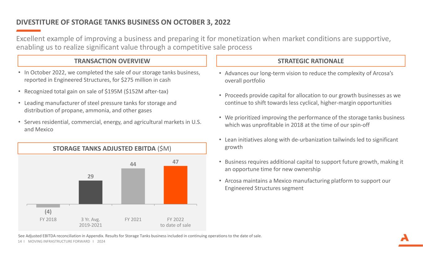 INFRASTRUCTURE SPENDING We believe our businesses are well-positioned to benefit from ~$1.4 trillion in expected spending from recent federal stimulus packages Infrastructure Investment and Jobs Act • Reauthorization of the Fixing America’s Surface Transportation Act (FAST Act) at a higher level of spending through 2026 • Spending catalysts to Arcosa: • Highway, Road, Bridges ($110B) • Passenger and Freight Rail ($66B) • Airports ($25B) • Power Infrastructure and Grid Hardening ($73B) • Broadband Expansion ($65B) • Ports and Waterways ($17B) Inflation Reduction Act • Provides ~$370B of investments into energy security and climate change • Includes multi-year extension of wind power PTC and new Advanced Manufacturer’s tax credit Bidding on new infrastructure projects is up. We expect this increased demand to impact our businesses throughout 2024 and beyond 13 I MOVING INFRASTRUCTURE FORWARD I 2024