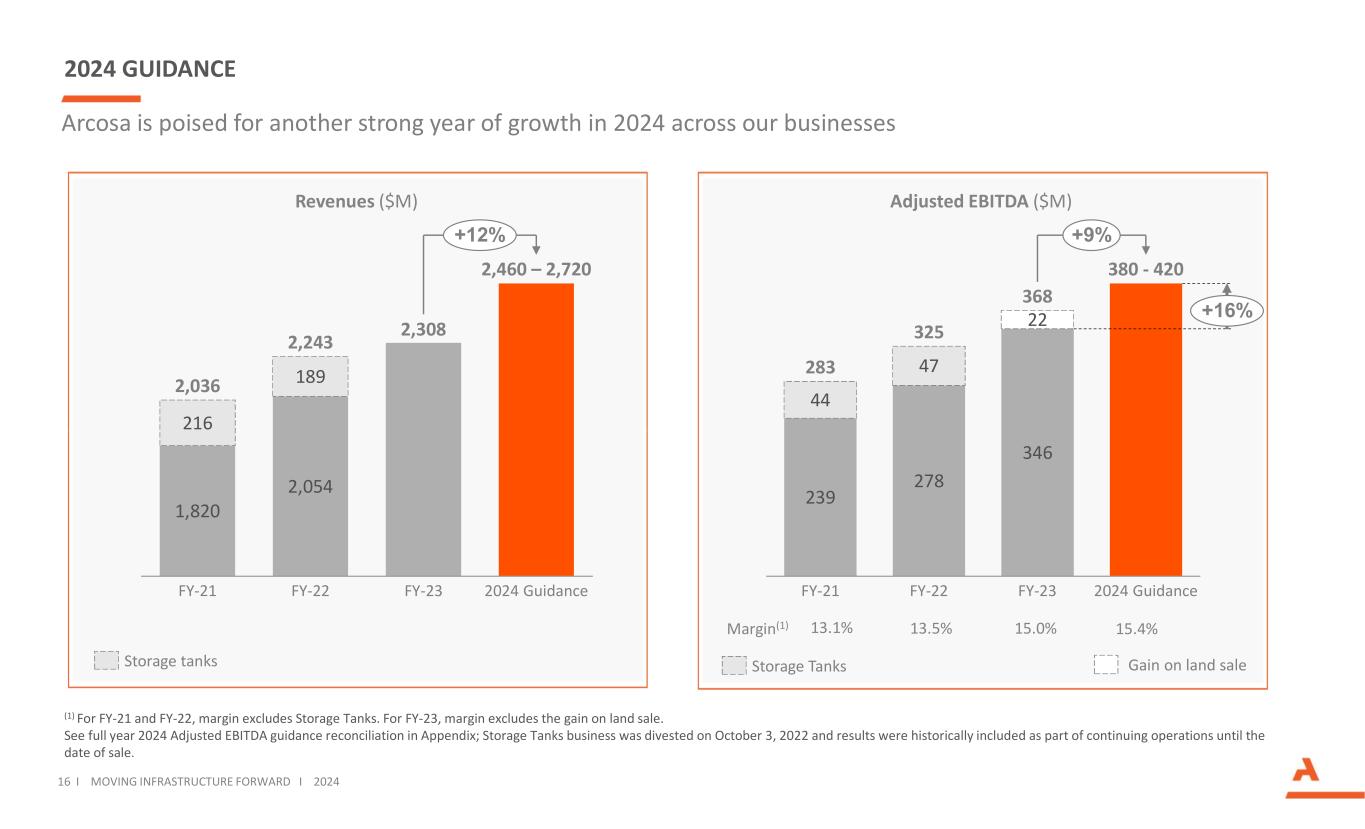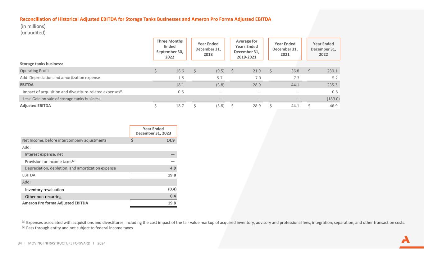 (1) Expenses associated with acquisitions and divestitures, including the cost impact of the fair value markup of acquired inventory, advisory and professional fees, integration, separation, and other transaction costs. (2) Pass through entity and not subject to federal income taxes Reconciliation of Historical Adjusted EBITDA for Storage Tanks Businesses and Ameron Pro Forma Adjusted EBITDA (in millions) (unaudited) 34 I MOVING INFRASTRUCTURE FORWARD I 2024 Three Months Ended September 30, 2022 Year Ended December 31, 2018 Average for Years Ended December 31, 2019-2021 Year Ended December 31, 2021 Year Ended December 31, 2022 Storage tanks business: Operating Profit $ 16.6 $ (9.5) $ 21.9 $ 36.8 $ 230.1 Add: Depreciation and amortization expense 1.5 5.7 7.0 7.3 5.2 EBITDA 18.1 (3.8) 28.9 44.1 235.3 Impact of acquisition and divestiture-related expenses(1) 0.6 — — — 0.6 Less: Gain on sale of storage tanks business — — — — (189.0) Adjusted EBITDA $ 18.7 $ (3.8) $ 28.9 $ 44.1 $ 46.9 Year Ended December 31, 2023 Net Income, before intercompany adjustments $ 14.9 Add: Interest expense, net — Provision for income taxes(2) — Depreciation, depletion, and amortization expense 4.9 EBITDA 19.8 Add: Inventory revaluation (0.4) Other non-recurring 0.4 Ameron Pro forma Adjusted EBITDA 19.8