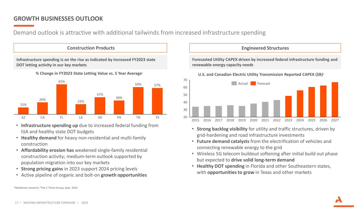 Arcosa is poised for another strong year of growth in 2024 across our businesses (1) For FY-21 and FY-22, margin excludes Storage Tanks. For FY-23, margin excludes the gain on land sale. See full year 2024 Adjusted EBITDA guidance reconciliation in Appendix; Storage Tanks business was divested on October 3, 2022 and results were historically included as part of continuing operations until the date of sale. 2024 GUIDANCE 239 278 346 44 47 22 FY-21 FY-22 FY-23 2024 Guidance 283 325 368 380 - 420 +16% +9% Adjusted EBITDA ($M) 16 I MOVING INFRASTRUCTURE FORWARD I 2024 Margin(1) 15.0% 15.4% 1,820 2,054 2,308 216 189 FY-21 FY-22 FY-23 2024 Guidance 2,036 2,243 2,460 – 2,720 +12% Revenues ($M) Storage TanksStorage tanks Gain on land sale 13.5%13.1%