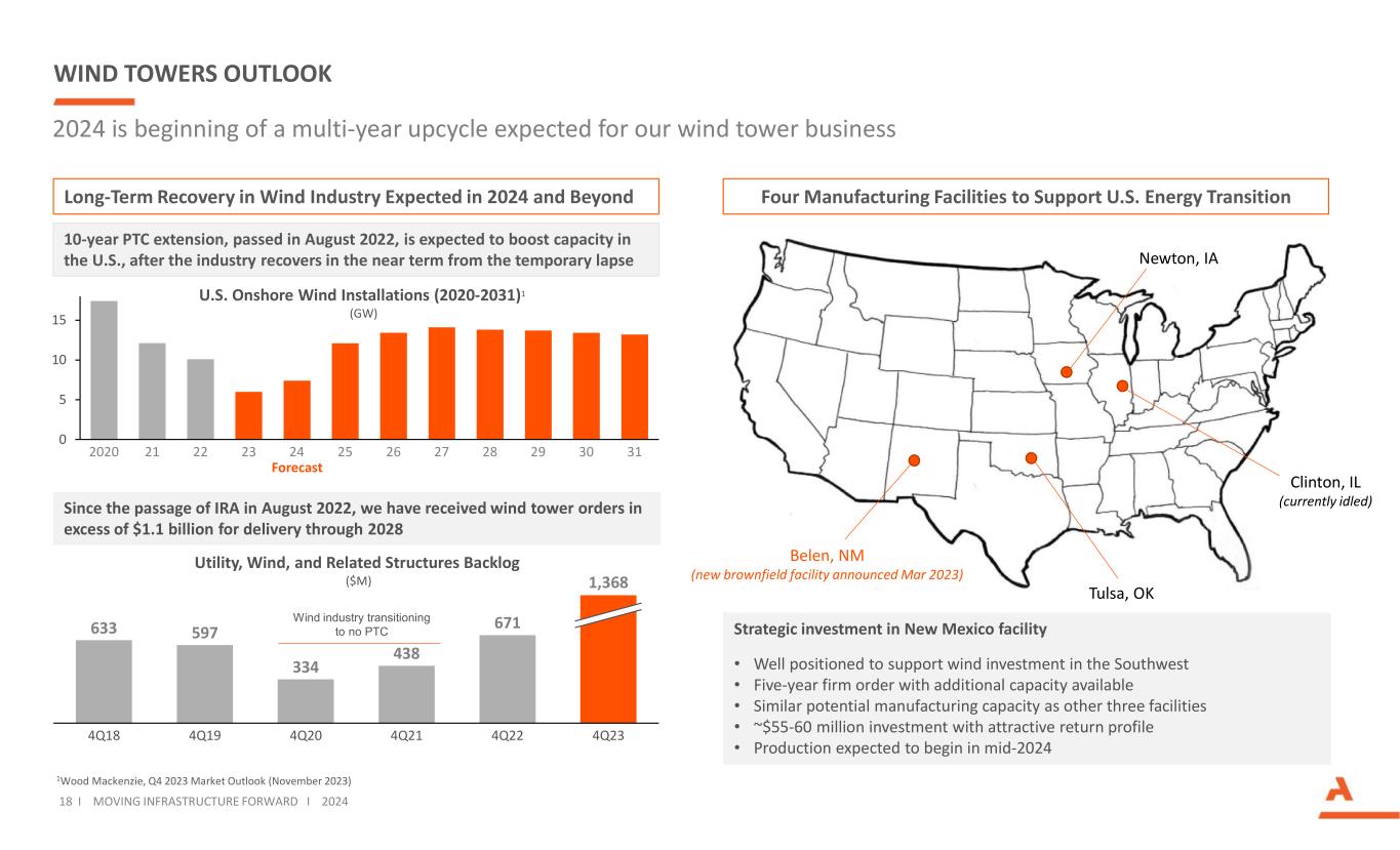 GROWTH BUSINESSES OUTLOOK Demand outlook is attractive with additional tailwinds from increased infrastructure spending Engineered Structures • Infrastructure spending up due to increased federal funding from IIJA and healthy state DOT budgets • Healthy demand for heavy non-residential and multi-family construction • Affordability erosion has weakened single-family residential construction activity; medium-term outlook supported by population migration into our key markets • Strong pricing gains in 2023 support 2024 pricing levels • Active pipeline of organic and bolt-on growth opportunities • Strong backlog visibility for utility and traffic structures, driven by grid-hardening and road infrastructure investments • Future demand catalysts from the electrification of vehicles and connecting renewable energy to the grid • Wireless 5G telecom buildout softening after initial build out phase but expected to drive solid long-term demand • Healthy DOT spending in Florida and other Southeastern states, with opportunities to grow in Texas and other markets 17 I MOVING INFRASTRUCTURE FORWARD I 2024 Infrastructure spending is on the rise as indicated by increased FY2023 state DOT letting activity in our key markets % Change in FY2023 State Letting Value vs. 5 Year Average1 20 30 40 50 60 70 2015 2016 2017 2018 2019 2020 2021 2022 2023 2024 2025 2026 2027 Actual Forecast U.S. and Canadian Electric Utility Transmission Reported CAPEX ($B)2 Forecasted Utility CAPEX driven by increased federal infrastructure funding and renewable energy capacity needs 1Wallstreet research; 2The C Three Group, Sept. 2023 Construction Products 15% 26% 65% 22% 37% 30% 59% 57% AZ LA OK PA TN TXCA FL