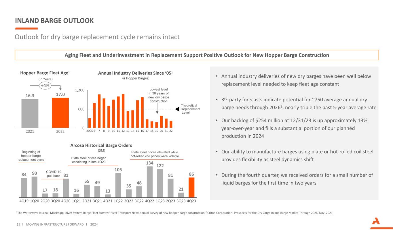 INLAND BARGE OUTLOOK 19 I MOVING INFRASTRUCTURE FORWARD I 2024 84 90 17 18 81 16 55 49 13 105 35 48 134 122 81 21 86 4Q19 1Q20 2Q20 3Q20 4Q20 1Q21 2Q21 3Q21 4Q21 1Q22 2Q22 3Q22 4Q22 1Q23 2Q23 3Q23 4Q23 16.3 17.0 2021 2022 +4% Hopper Barge Fleet Age1 (in Years) 0 600 1,200 2005 6 7 8 9 10 11 12 13 14 15 16 17 18 19 20 21 22 Theoretical Replacement Level Annual Industry Deliveries Since ‘052 (# Hopper Barges) Lowest level in 30 years of new dry barge construction Arcosa Historical Barge Orders ($M) COVID-19 pull-back Plate steel prices elevated while hot-rolled coil prices were volatile Plate steel prices began escalating in late 4Q20 Beginning of hopper barge replacement cycle Outlook for dry barge replacement cycle remains intact 1The Waterways Journal: Mississippi River System Barge Fleet Survey; 2River Transport News annual survey of new hopper barge construction; 3Criton Corporation: Prospects for the Dry Cargo Inland Barge Market Through 2026, Nov. 2021; • Annual industry deliveries of new dry barges have been well below replacement level needed to keep fleet age constant • 3rd-party forecasts indicate potential for ~750 average annual dry barge needs through 20263, nearly triple the past 5-year average rate • Our backlog of $254 million at 12/31/23 is up approximately 13% year-over-year and fills a substantial portion of our planned production in 2024 • Our ability to manufacture barges using plate or hot-rolled coil steel provides flexibility as steel dynamics shift • During the fourth quarter, we received orders for a small number of liquid barges for the first time in two years Aging Fleet and Underinvestment in Replacement Support Positive Outlook for New Hopper Barge Construction